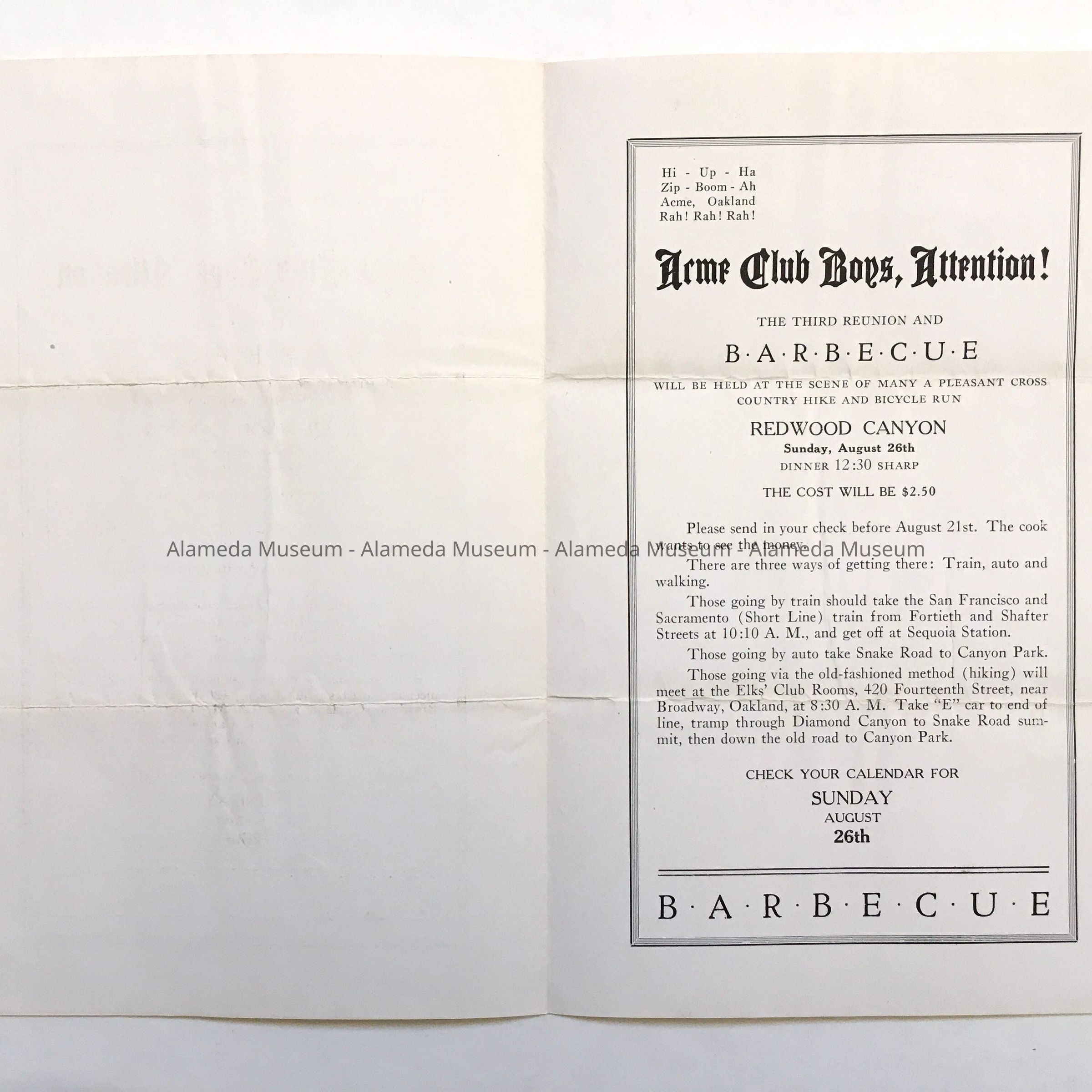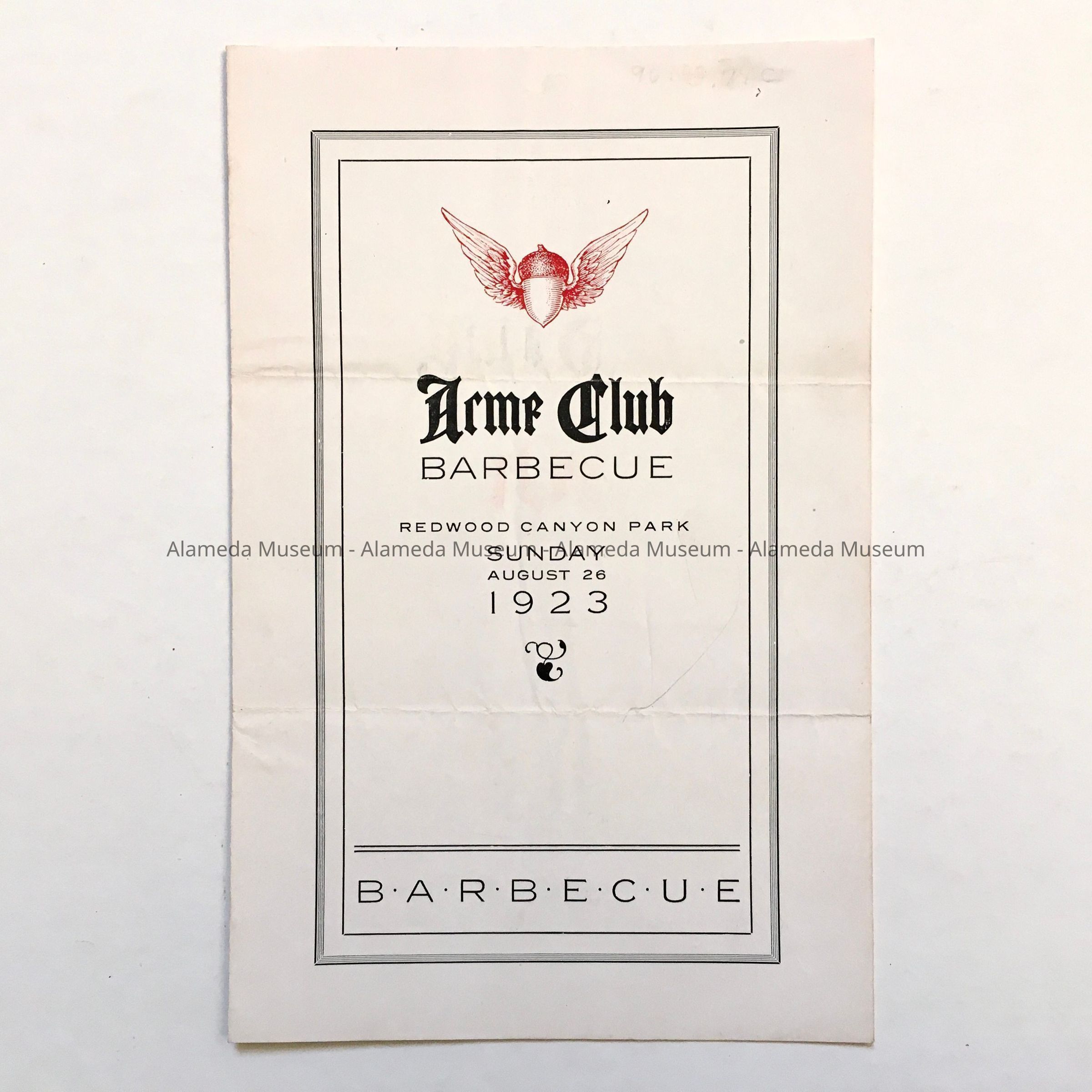 Invitation to Barbeque sponsored by the ACME Club, Redwood Canyon Park, 1923Entry/Object ID