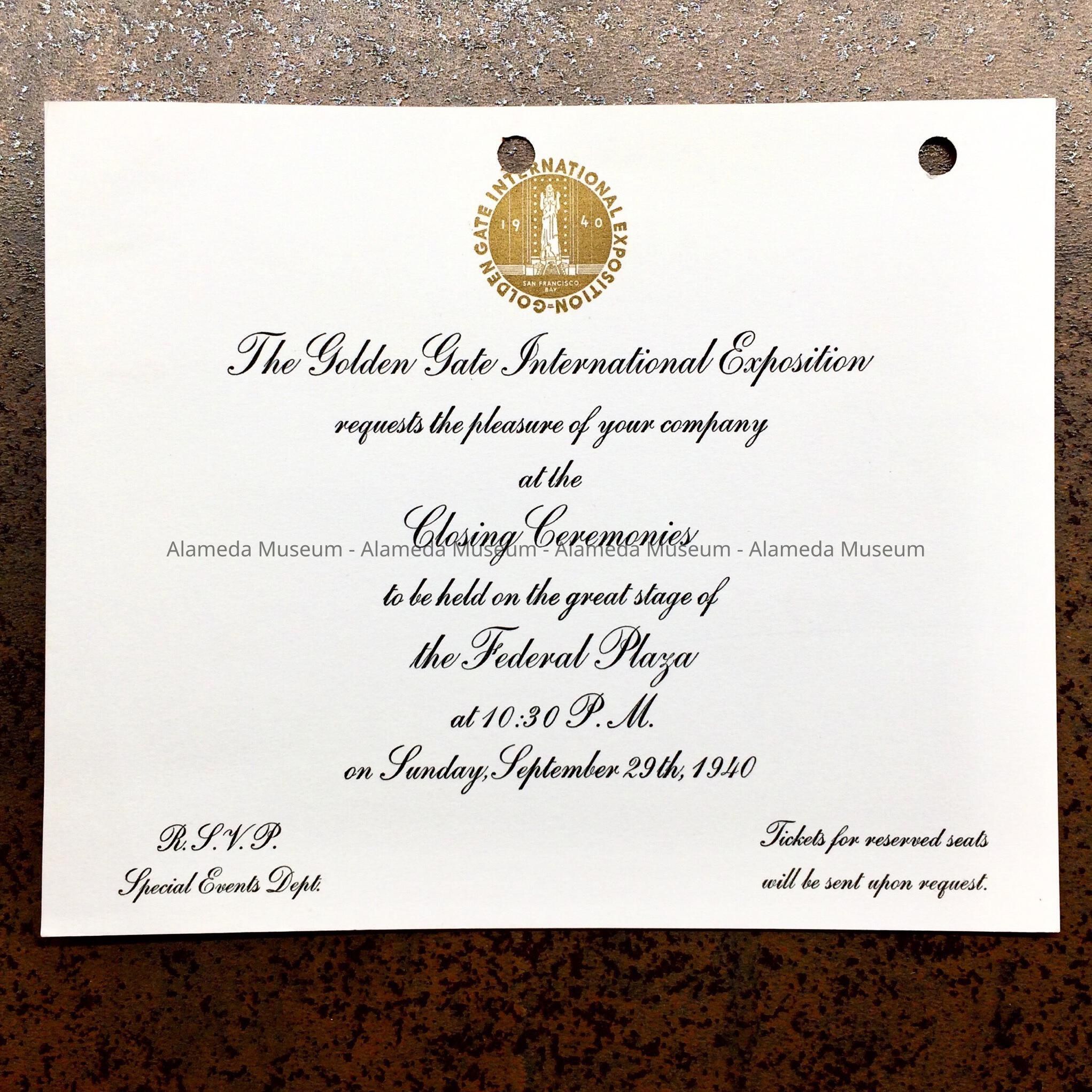 HISTORY OF OBJECT: AN INVITATION SENT TO CHARLES R. SCHWANENBERG, CITY MANAGER, INVITING HIM TO THE CLOSING CEREMONIES OF THE GOLDEN GATE INTERNATIONAL EXPOSITION, SEPTEMBER 29, 1940.