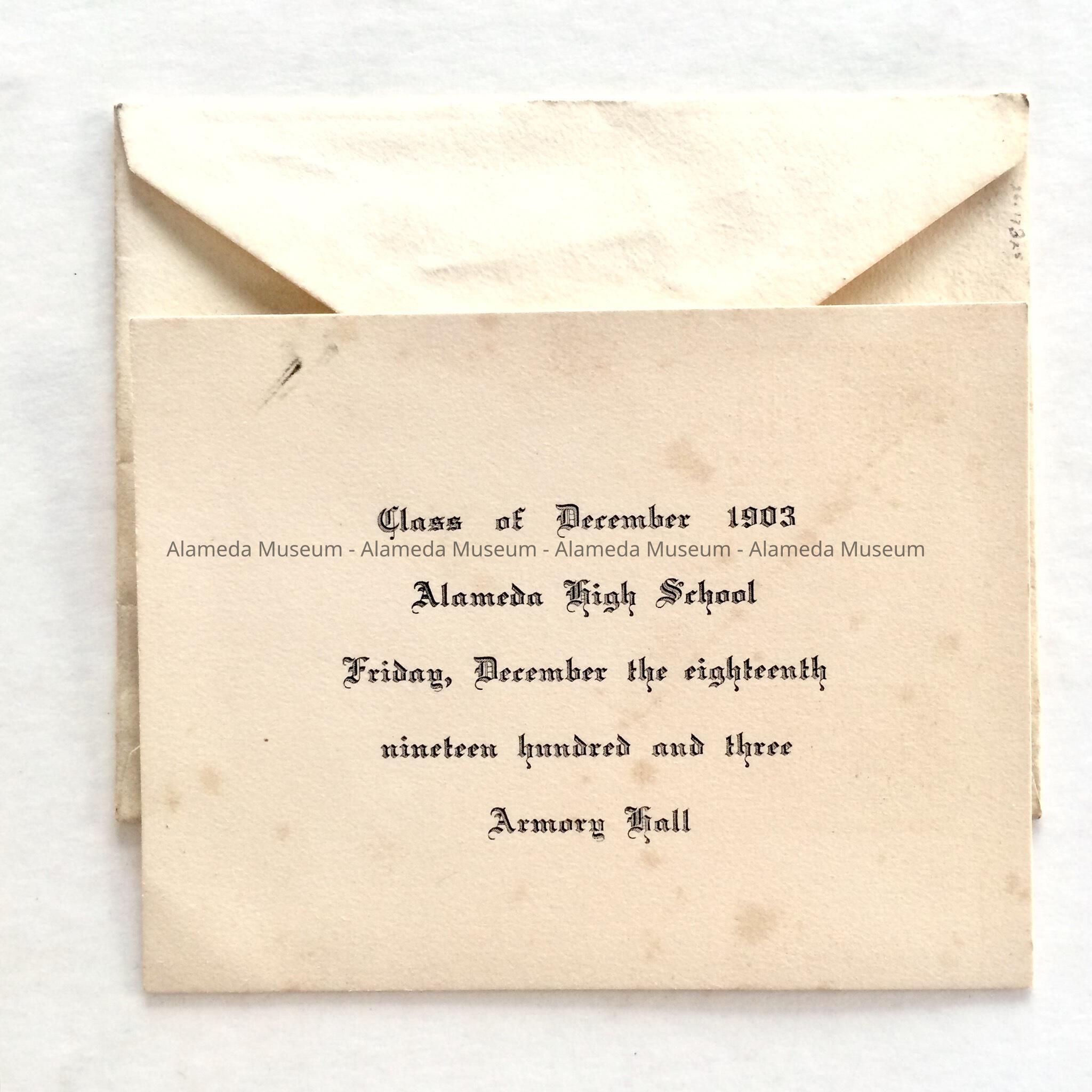 INVITATION TO THE GRADUATION CEREMONIES, CLASS OF DECEMBER, 1903, ALAMEDA HIGH SCHOOL, TO BE HELD AT ARMORY HALL, ALAMEDA, CALIFORNIA.