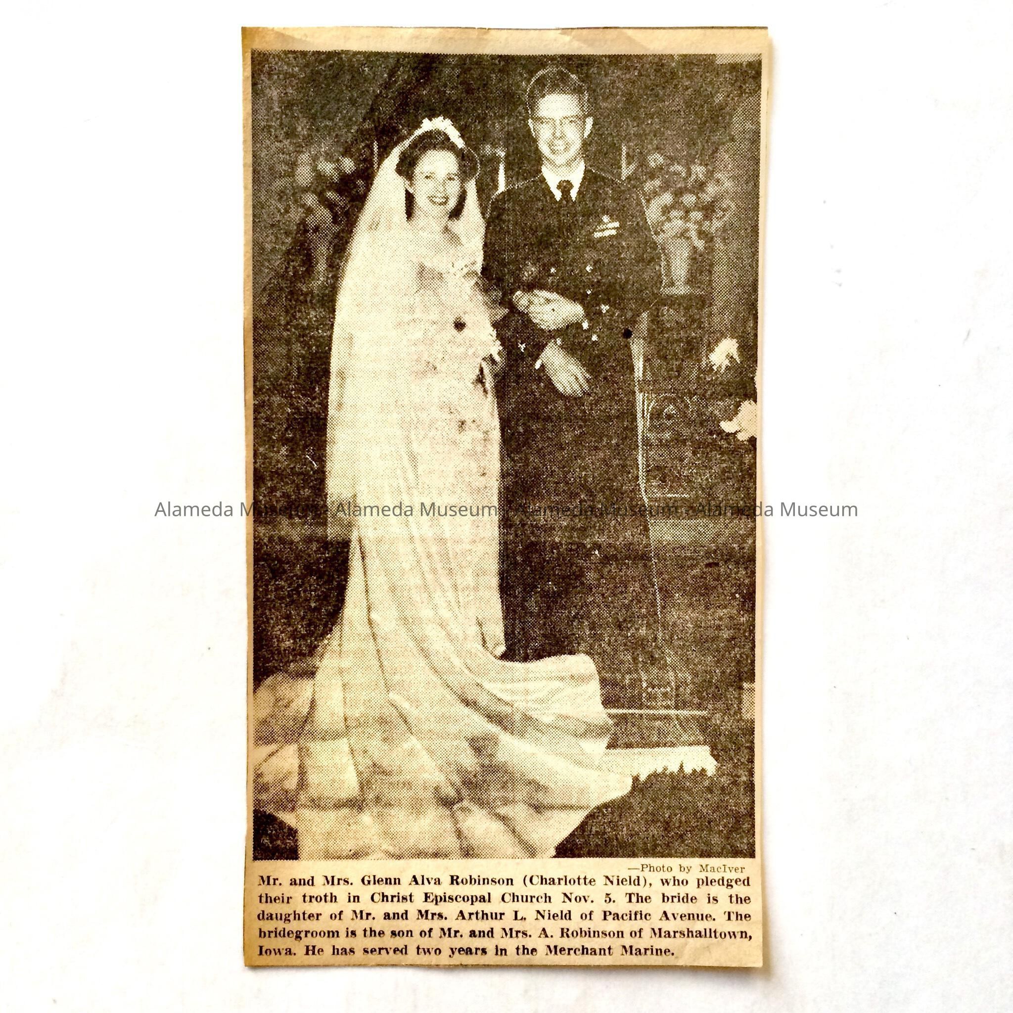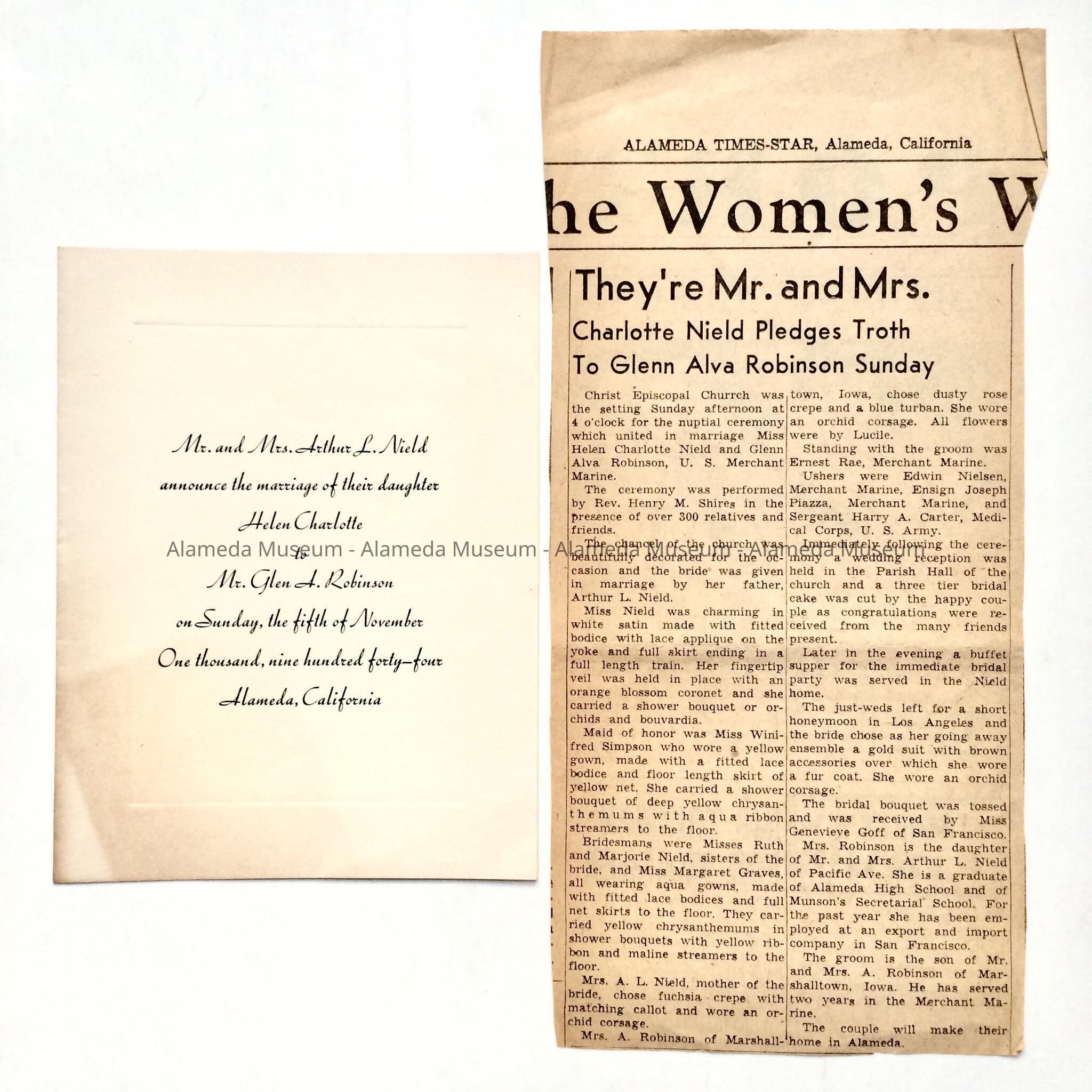 INVITATION TO THE MARRIAGE OF HELEN CHARLOTTE, DAUGHTER OF MR AND MRS ARTHUR L NIELD, TO GLEN A ROBINSON, CHRIST EPISCOPAL CHURCH, NOVEMBER 5, 1944. COLLECTION ALSO INCLUDES NEWSPAPER CLIPPING OF BRIDAL COUPLE, DATED NOVEMBER 15, 1944, AND ANOTHER NEWSPAPER CLIPPING FROM ALAMEDA TIMES-STAR, DESCRIBING THE WEDDING.