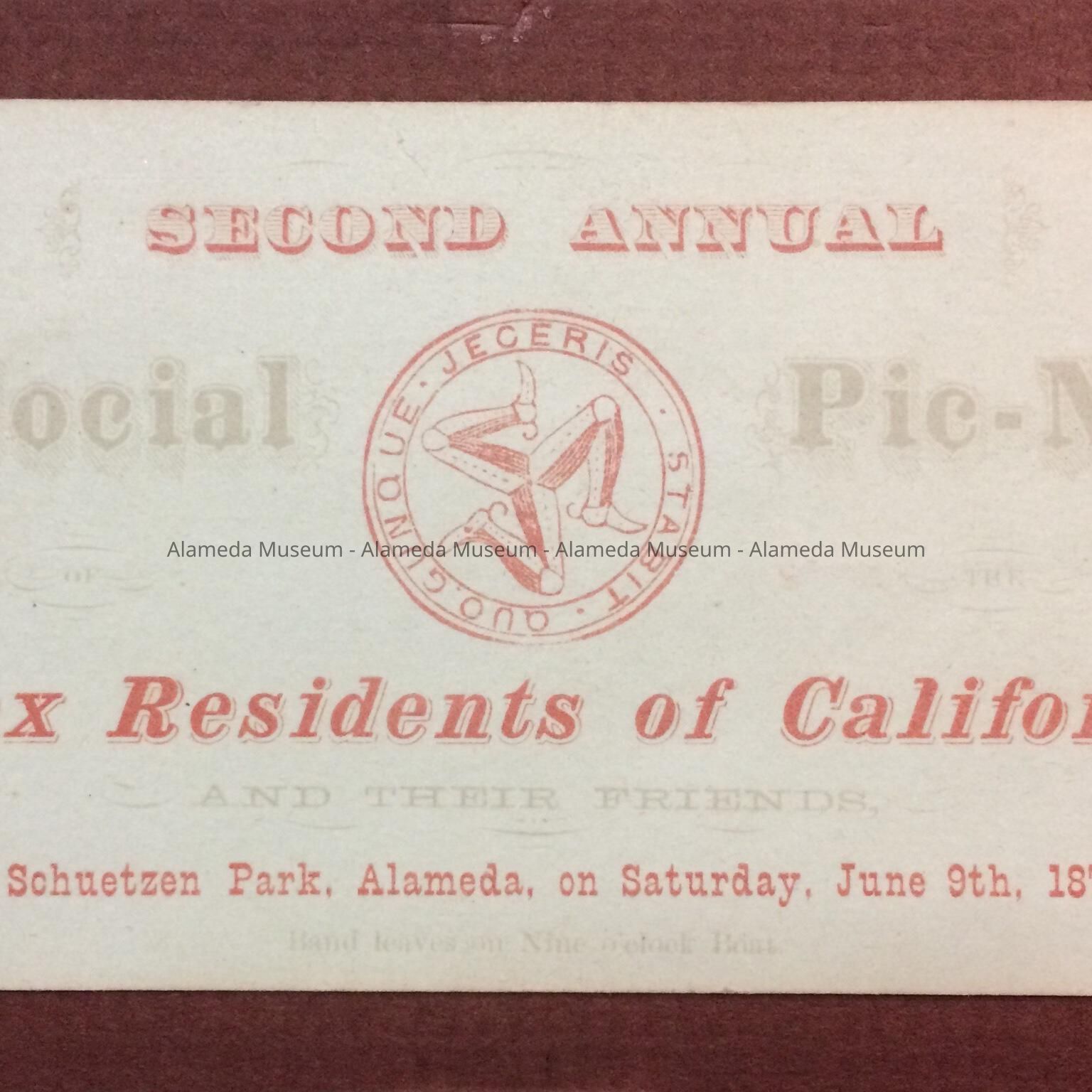 Description: A ticket on off-white paper, mounted on brown cardboard, with text printed in black and red ink, stating: "Second Annual Social Pic-Nic", "Manx Residents of California AND THEIR FRIENDS At Schuetzen Park, Alameda, on Saturday, June 9th, 1877", and in small print: “Band leaves on nine o'clock Boat."