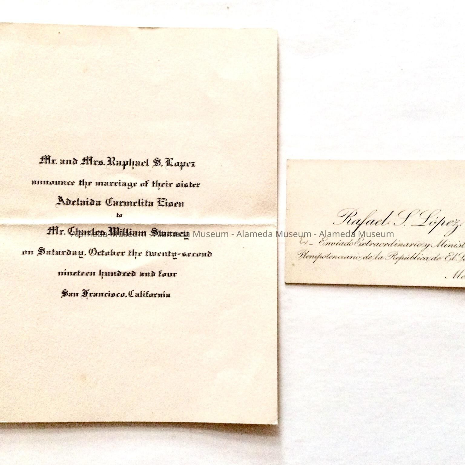 Wedding invitation of Adelaida Carmelita Eisen to Mr. Charles William Swasey, 1904. They eventually lived at 1336-38 Weber Street in a house that they had built in 1909.