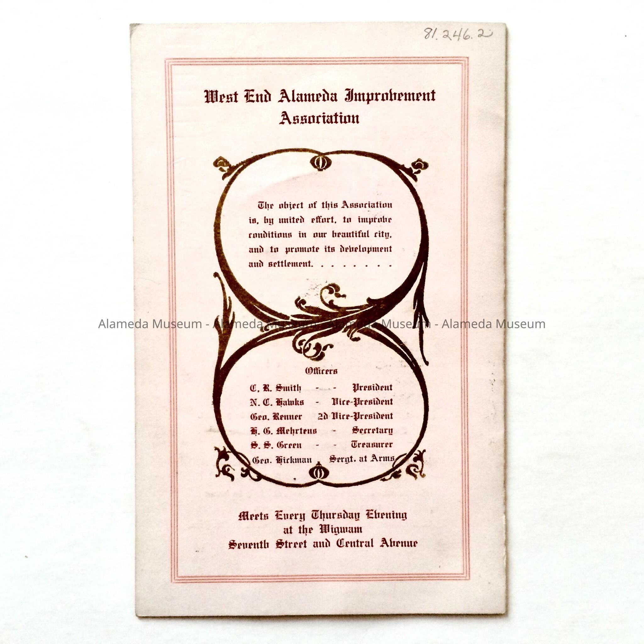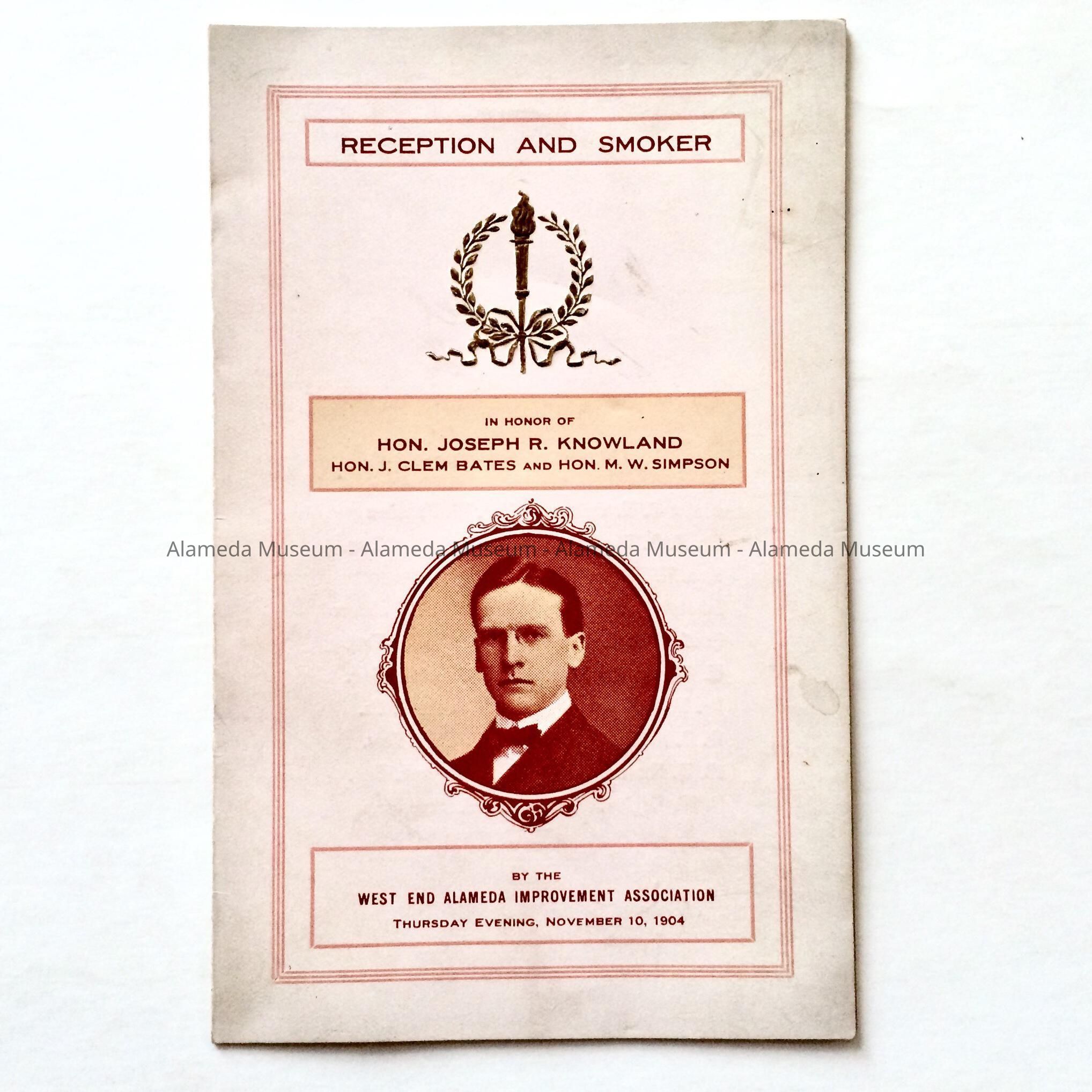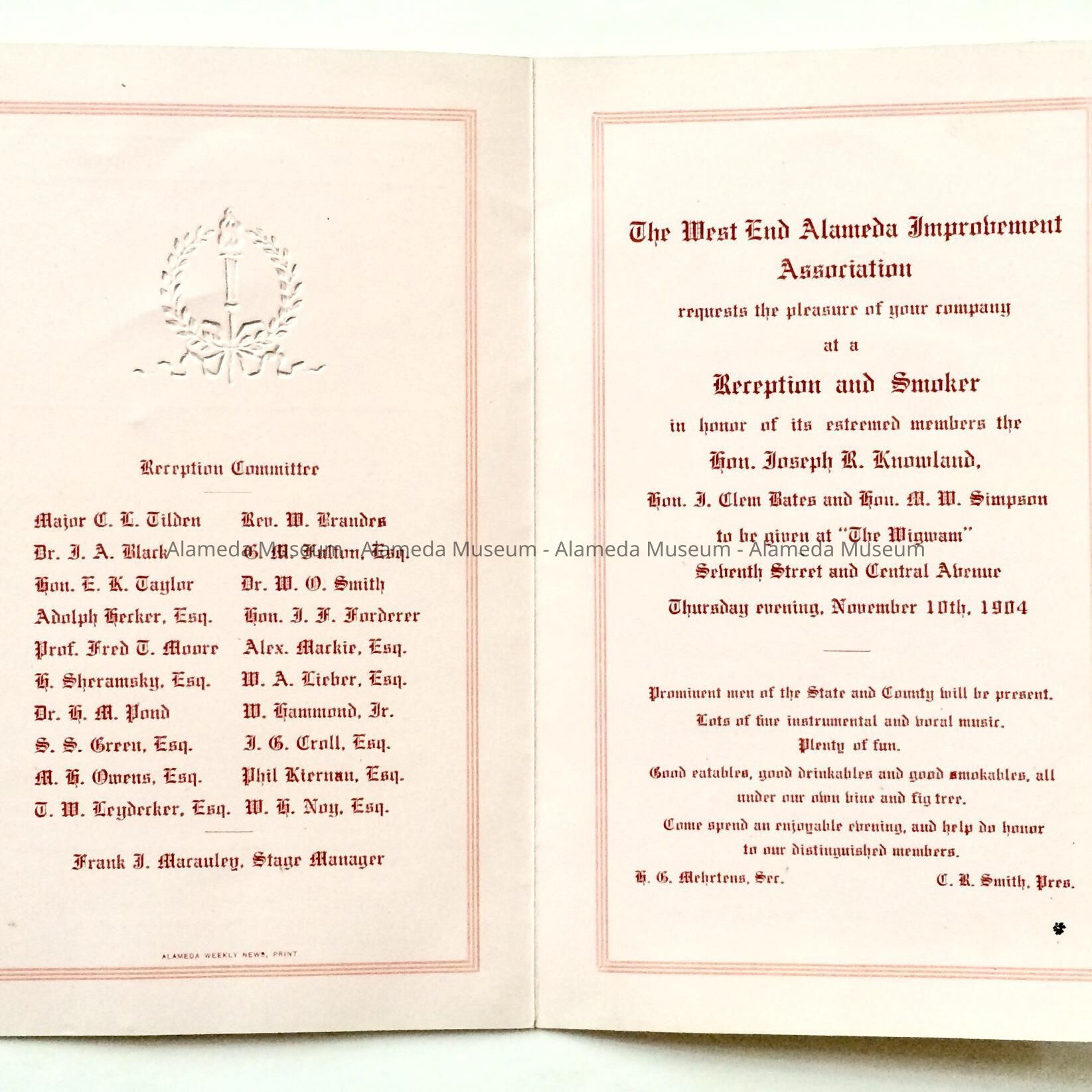 History of Object: Invitation to a reception and smoker in honor of Joseph R. Knowland, held by the West End Alameda Improvement Association, Thursday Evening, November 10, 1904. At the reception were some important names of Alameda history: E. K. Taylor (first mayor of Alameda); Major Tilden; W. H. Noy (who later became mayor of Alameda).