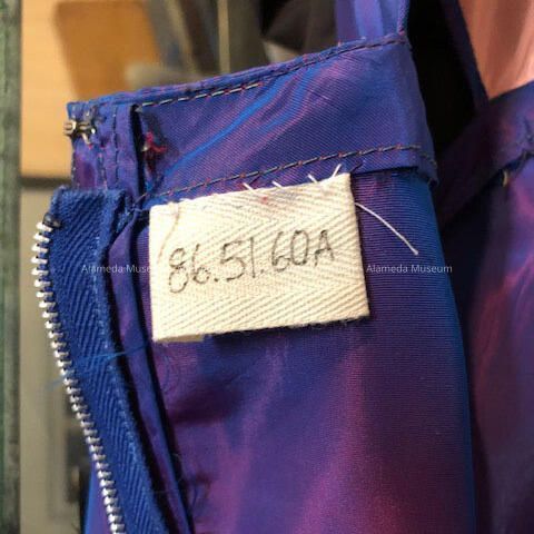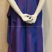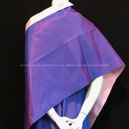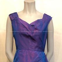 Evening dress & wrap of lavender iridescent taffeta. One piece dress with gathers at hip showing pink colored taffeta inset.