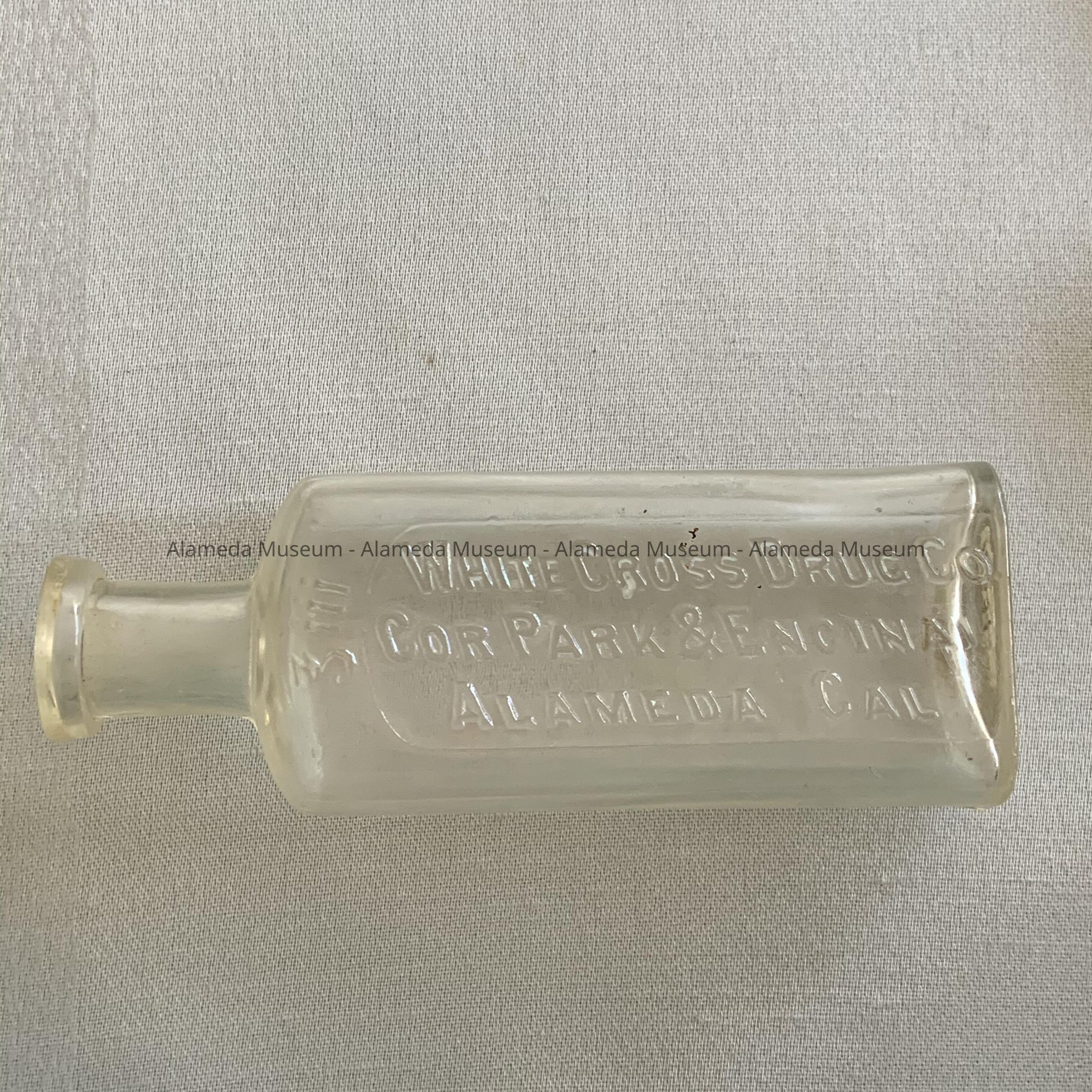 HISTORY OF OBJECT: A MEDICINAL BOTTLE ADVERTISING WHITE CROSS DRUG CO., CORNER OF PARK STREET AND ENCINAL AVENUE, ALAMEDA, CA.
