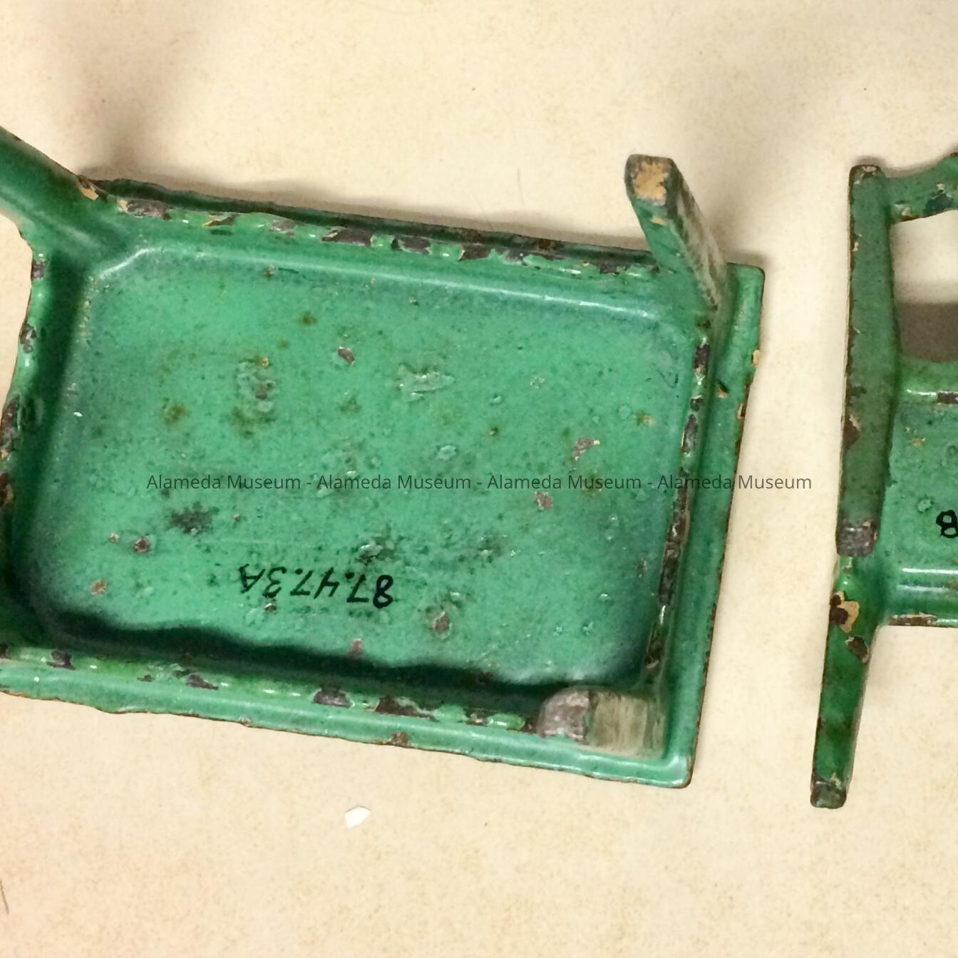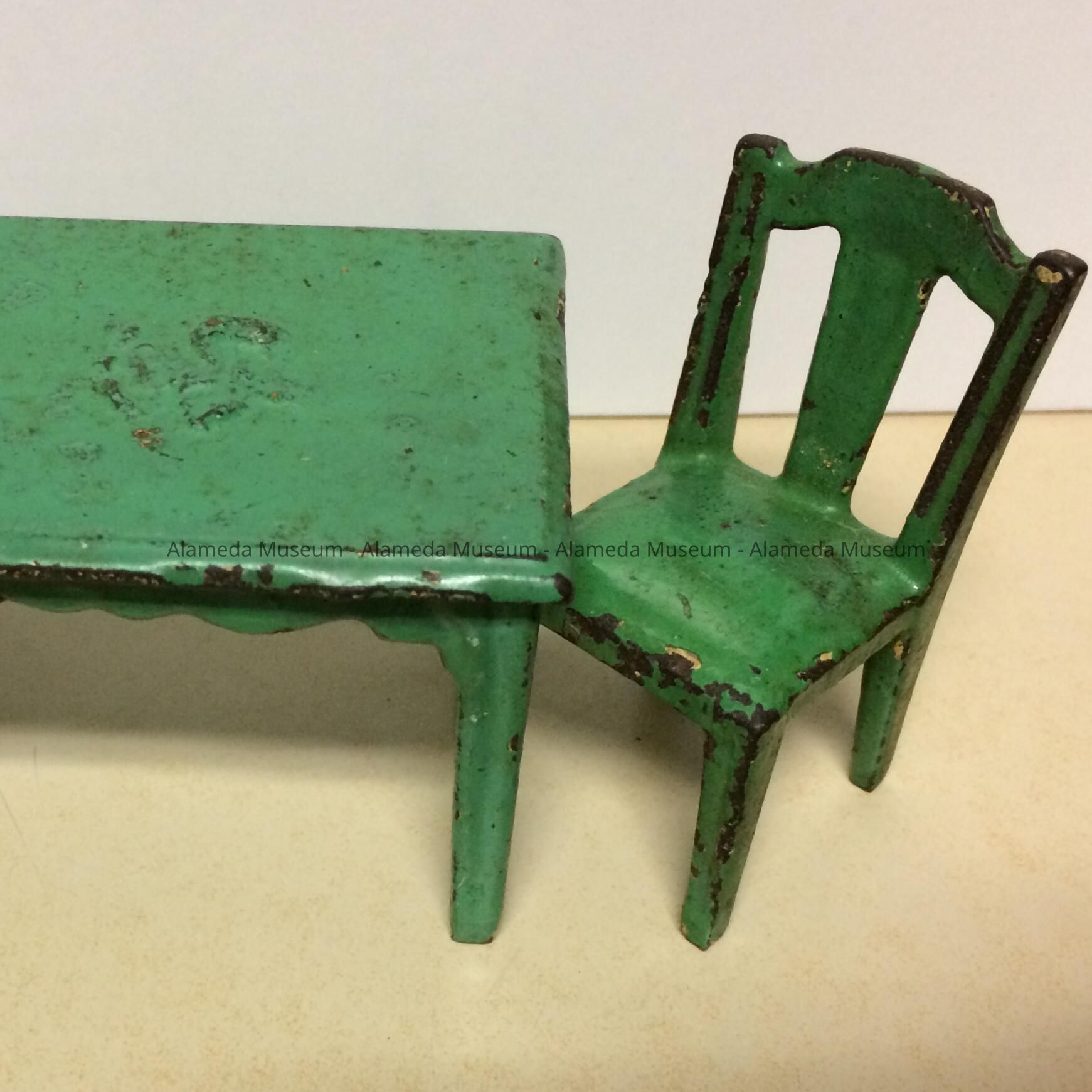 Cast iron dollhouse furniture consisting of a table & matching chair that belonged to the Meyers sisters (Mildred, Edith & Jeanette), daughters of H. H. Meyers, a noted Alameda architect.