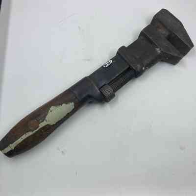 Monkey wrench of iron with adjustable jaws & wooden handle.