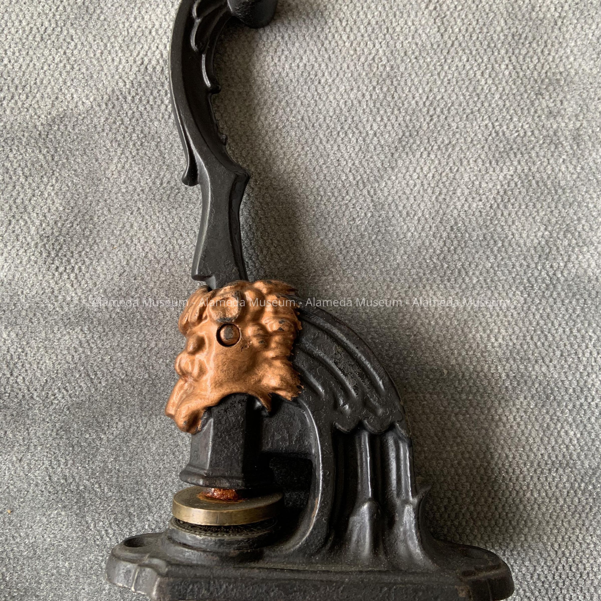 Description: AN OBLONG-SHAPED BASE SUPPORTS A FRAME WITH HANDLE. THE HANDLE IS MOVABLE, WHEN PRESSED ADDS PRESSURE TO AN ENGRAVED BRASS SEAL. DECORATIVE MOTIF CONSISTS OF A LION'S HEAD ACCENTUATED WITH COPPER PAINT ON A BACKGROUND OF JAPANNING. NO MANUFACTURER'S MARK NOTED.