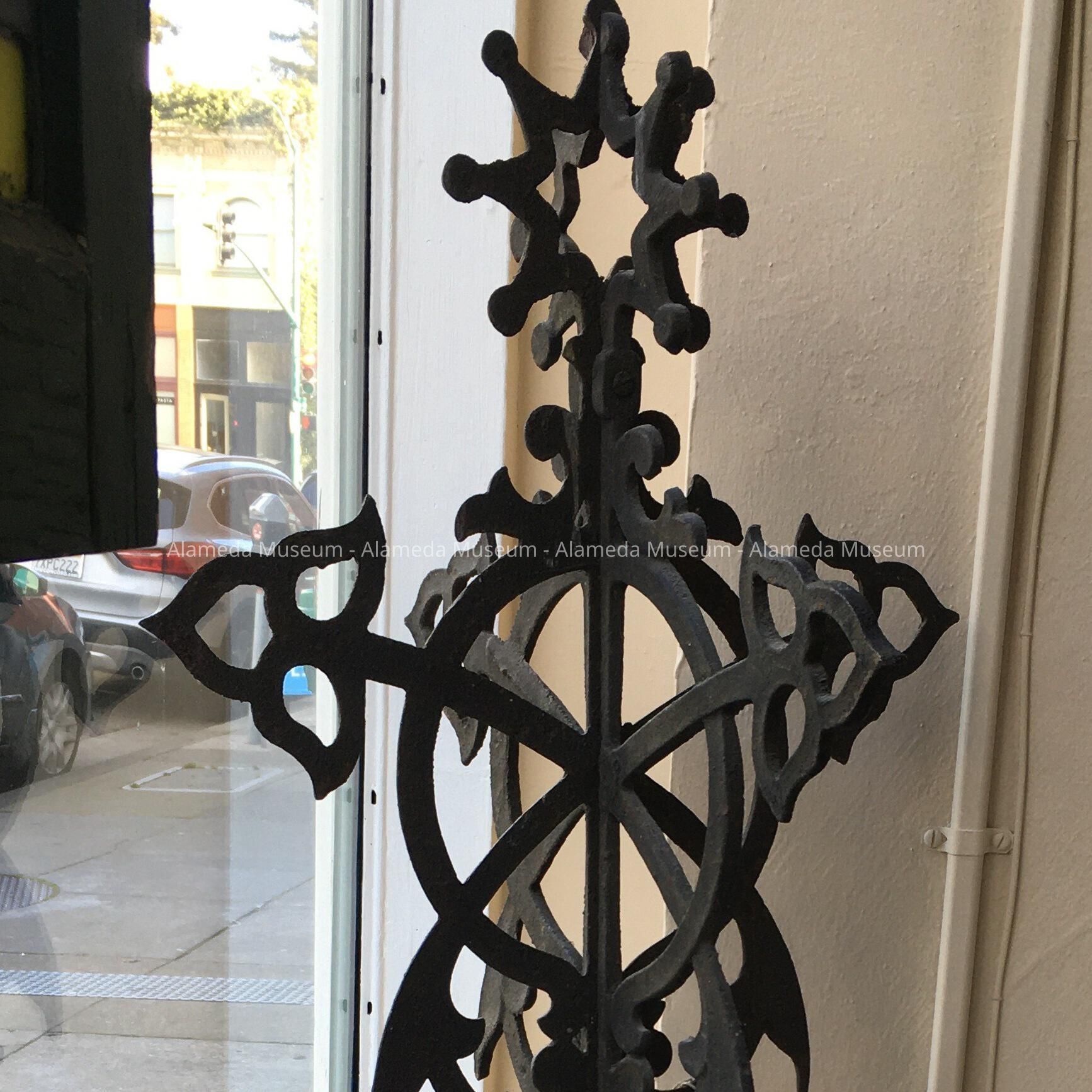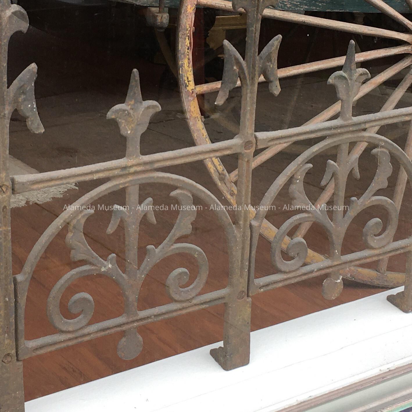 IRON CRESTING USED AS A FENCE IN FRONT OF THE WIEBALK RESIDENCE AT 2036 ALAMEDA AVENUE, ALAMEDA, CA. ACCORDING TO VERBAL FAMILY HISTORY, THE FENCING WAS REMOVED FROM THE ROOF OF ANOTHER VICTORIAN HOUSE IN THE 2000 BLOCK OF ALAMEDA AVENUE.
