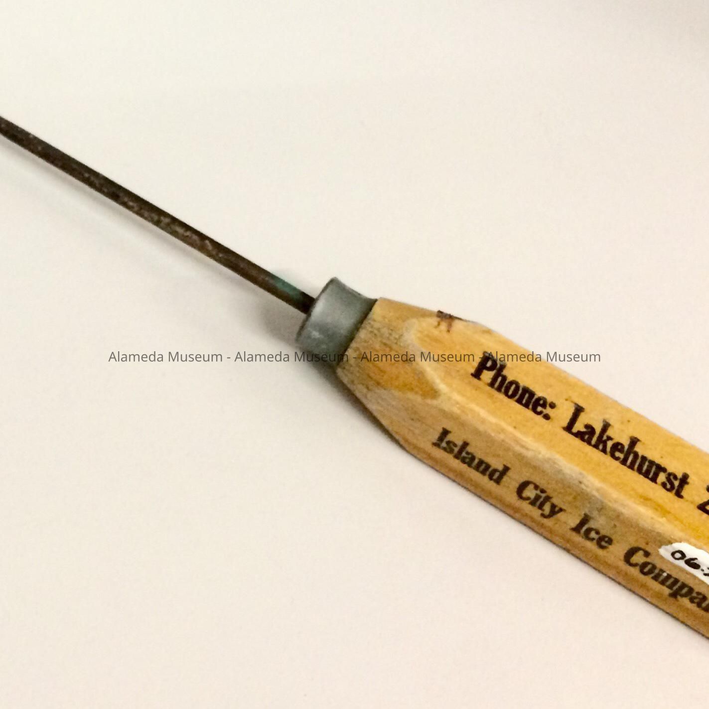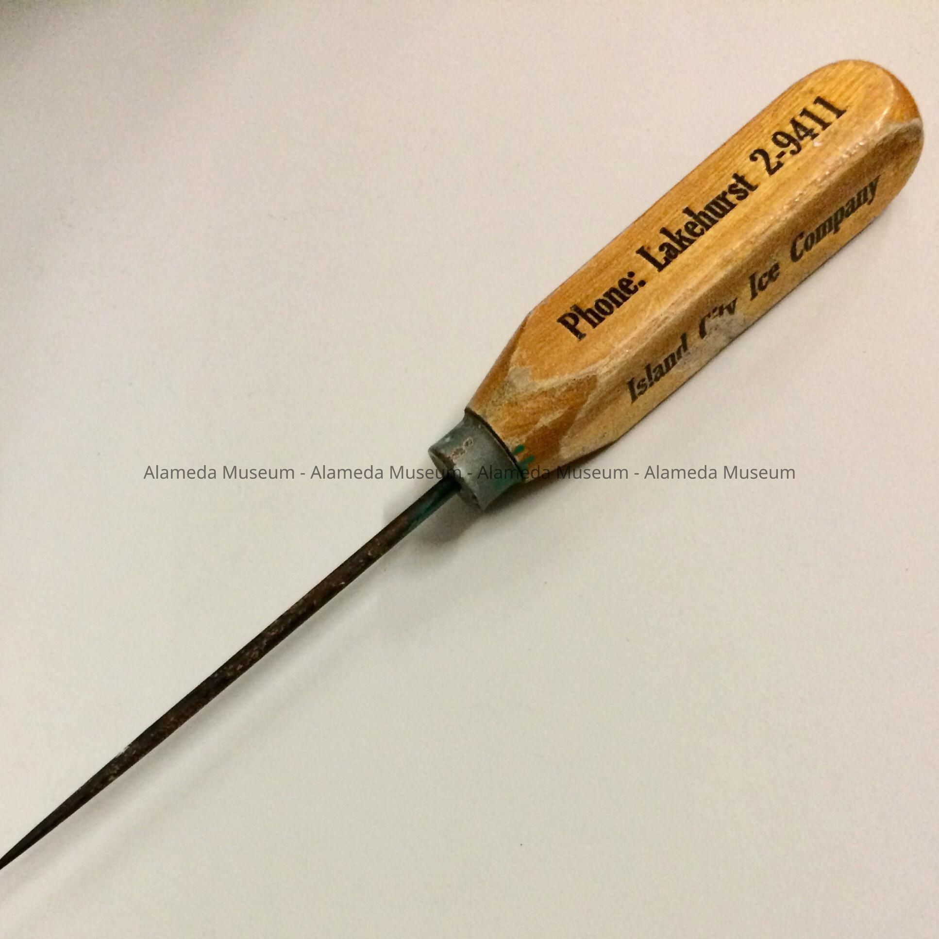 HISTORY OF OBJECT: AN ICE PICK ADVERTISING THE ISLAND CITY ICE COMPANY, TELEPHONE LA 2-9411.