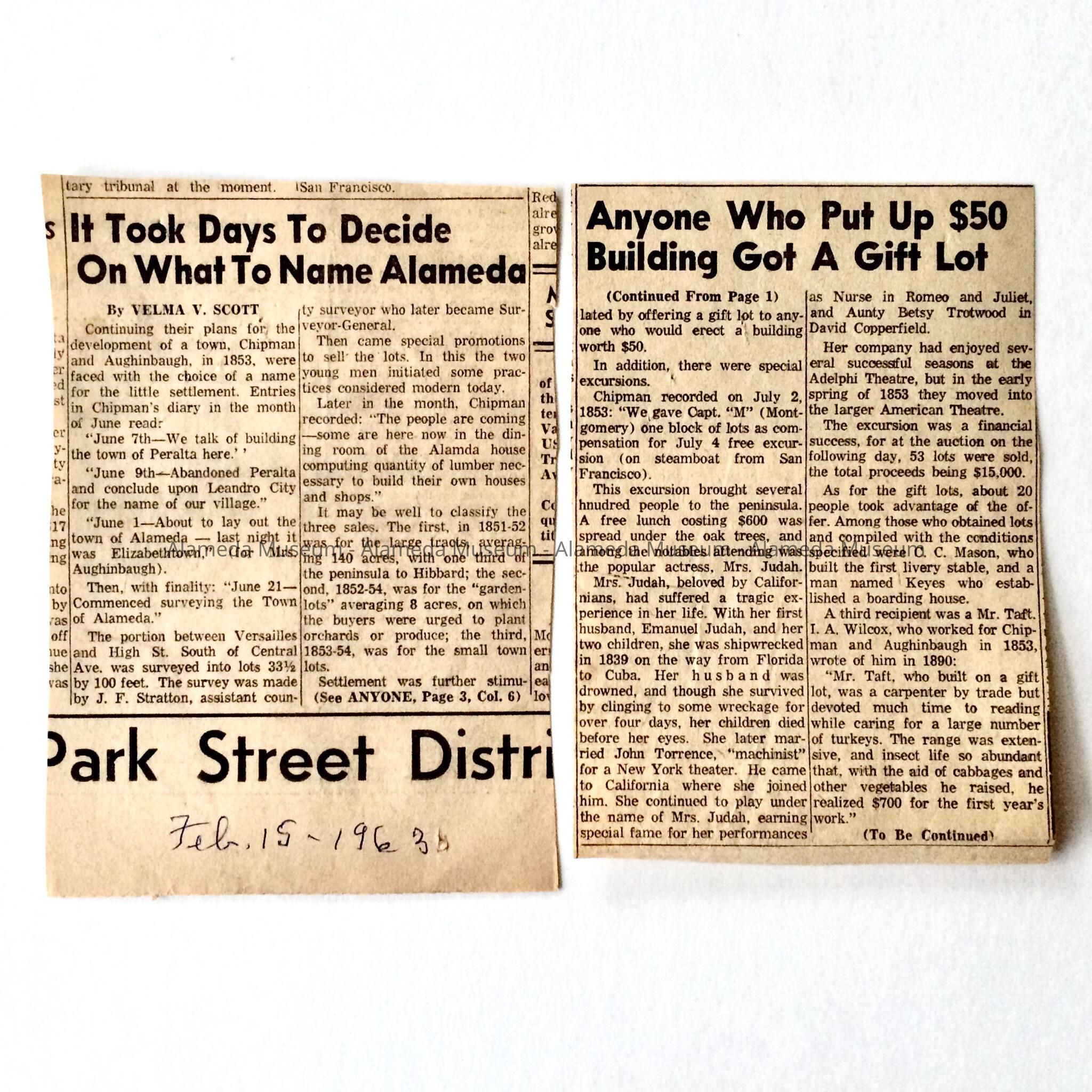 History: Newspaper clipping concerning the naming of the City of Alameda in the early 1850's. The article was written by Velma V. Scott and appeared in the Alameda Times Star on February 15, 1963.