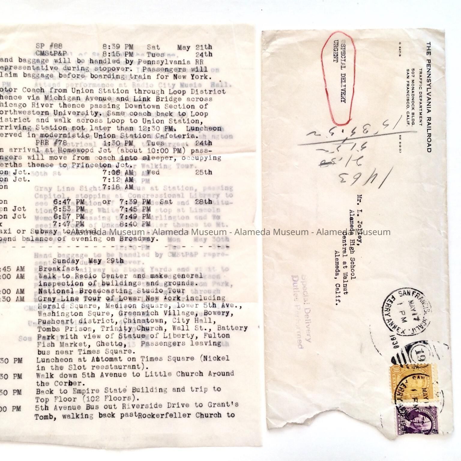 AN ITINERARY FROM THE PENNSYLVANIA RAILROAD CO., SENT TO COACH LEWIS C JOLLEY, ALAMEDA HIGH SCHOOL, CONCERNING A TRIP TAKEN BY HIM AND POSSIBLY STUDENT ATHLETES.