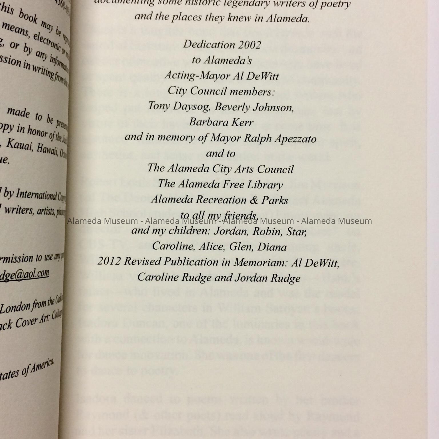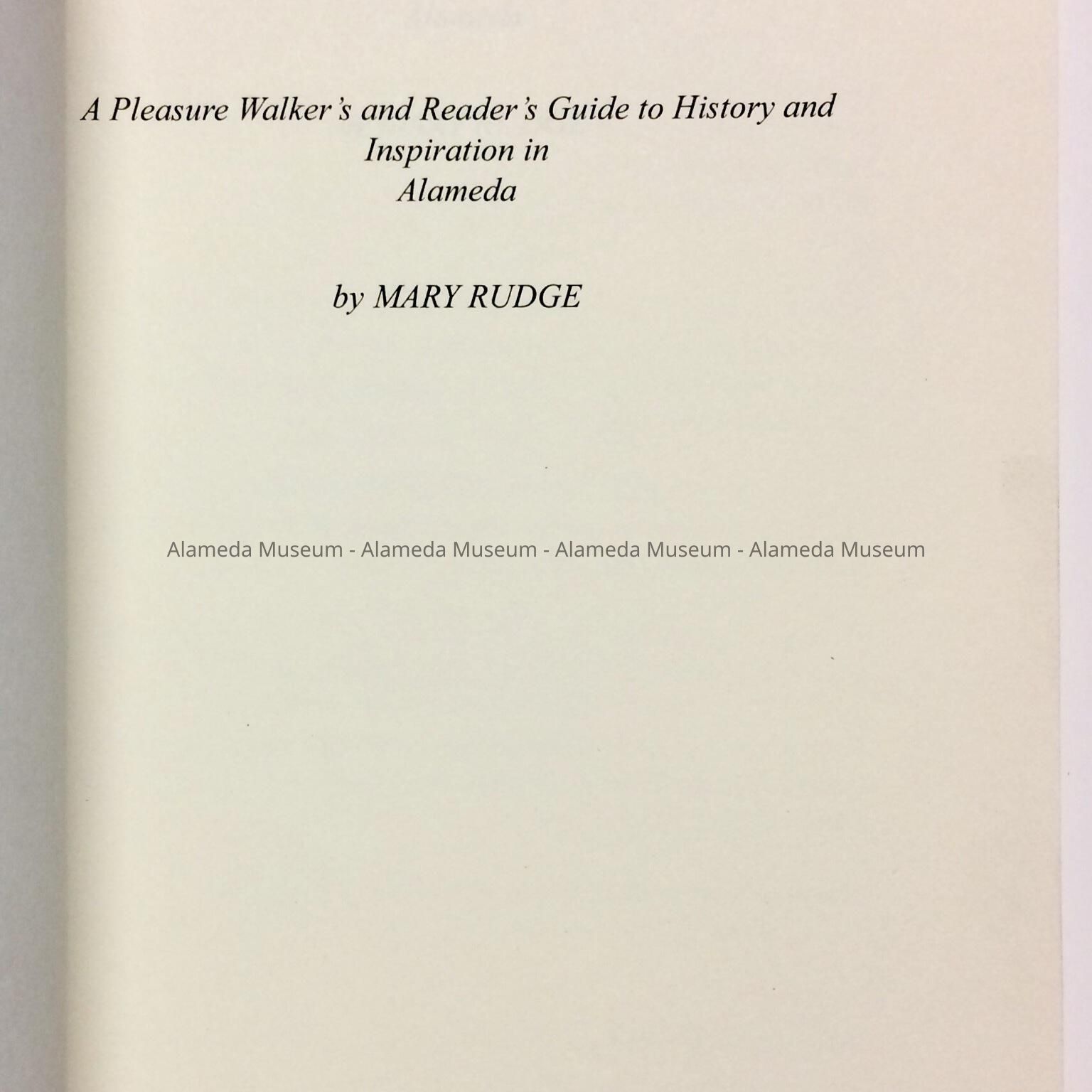 A BOOK ENTITLED, "JACK LONDON'S NEIGHBORHOOD," BY THE LATE MARY RUDGE (WHO PASSED AWAY IN JANUARY 2014). THE BOOK IS A PRIVATE PRINTING BY MRS RUDGE, FORMER POET LAUREATE OF THE CITY OF ALAMEDA. THE NARRATIVE HAS SEVERAL REFERENCES TO THE CITY OF ALAMEDA.