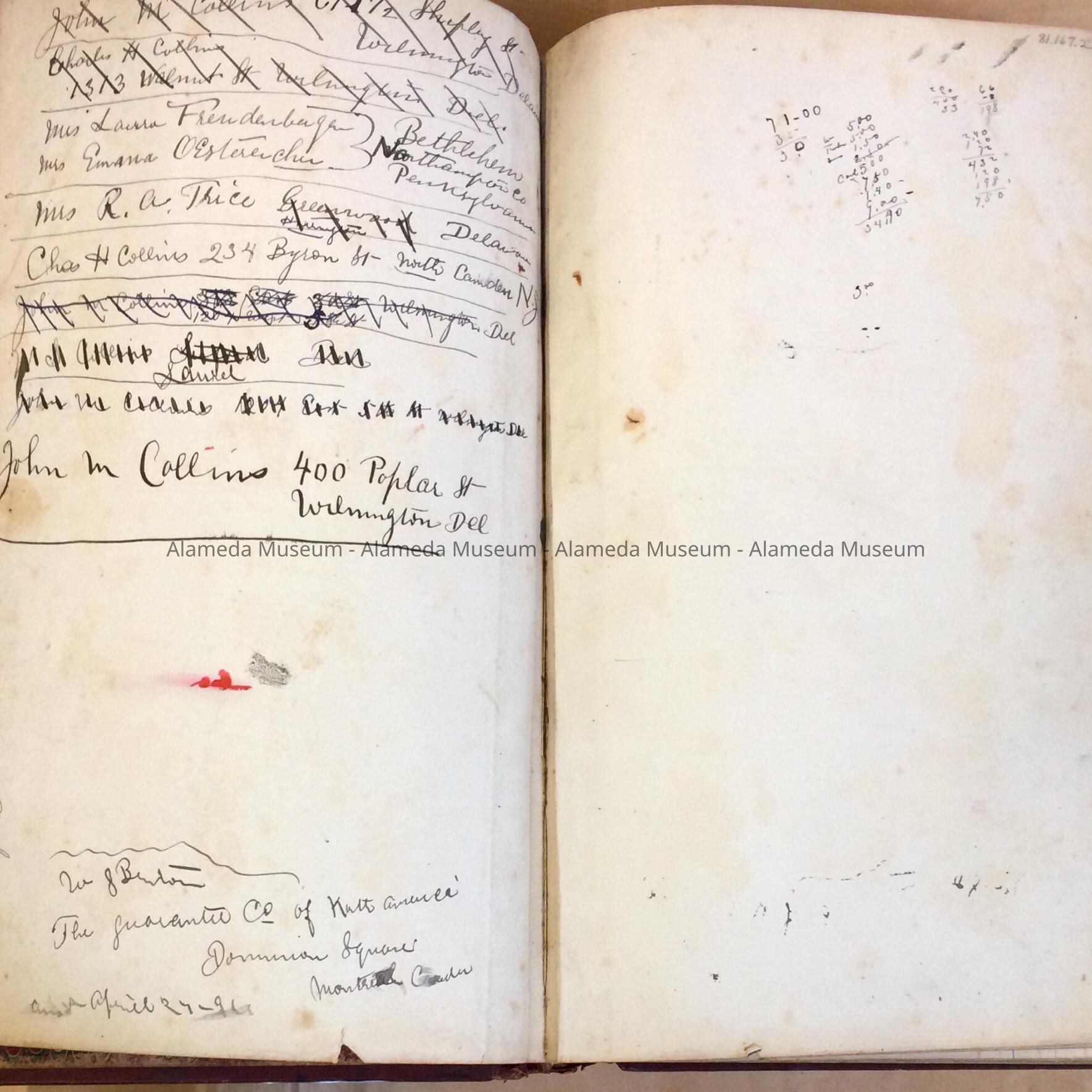 This is the ledger of J. A. Collins known to have been an active carpenter from mid 1880's to 1913, in the City of Alameda. It is a journal of a carpenter's work from 1891-1903, listing amount of materials used and labor required on specific building projects. It also lists the names of clients, some early pioneer residents of the community.