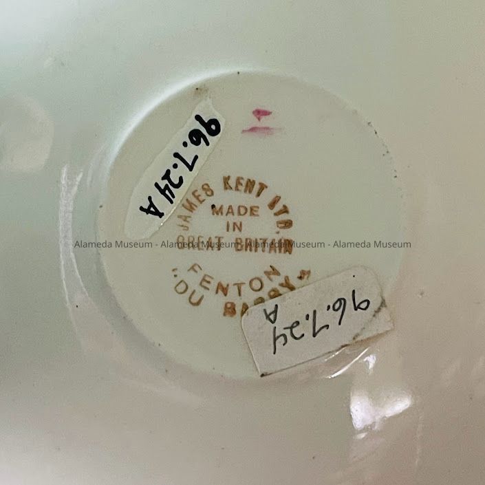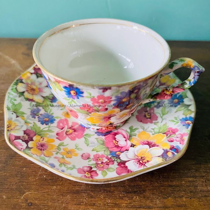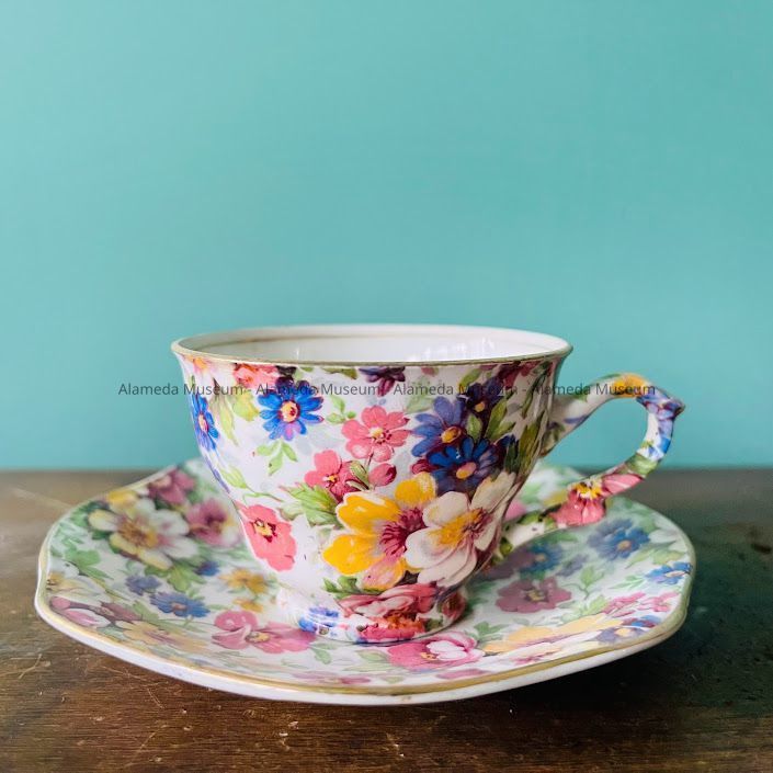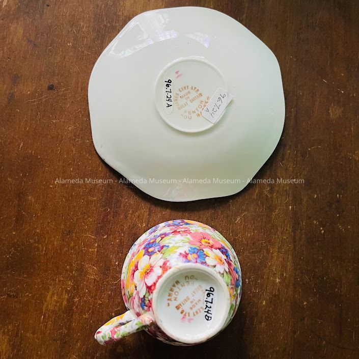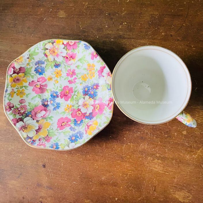 CUP AND SAUCER FROM THE COLLECTION OF THE LATE MRS SIDNEY HENDRICKSON OF 2941 FERNSIDE BLVD, ALAMEDA, CA.