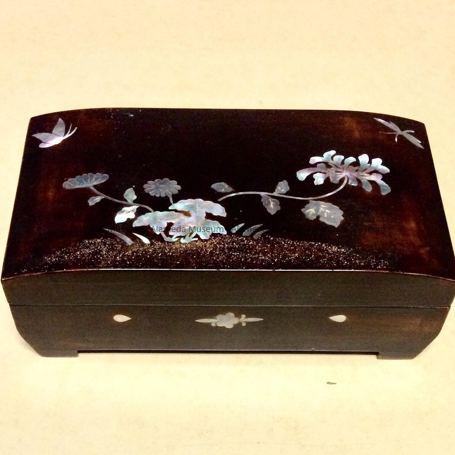 Description: An oblong shaped box that appears to be made of a deep brown colored lacquer. The exterior of the lid has inlaid designs of flowers and insects.