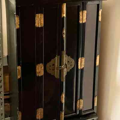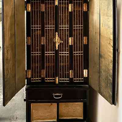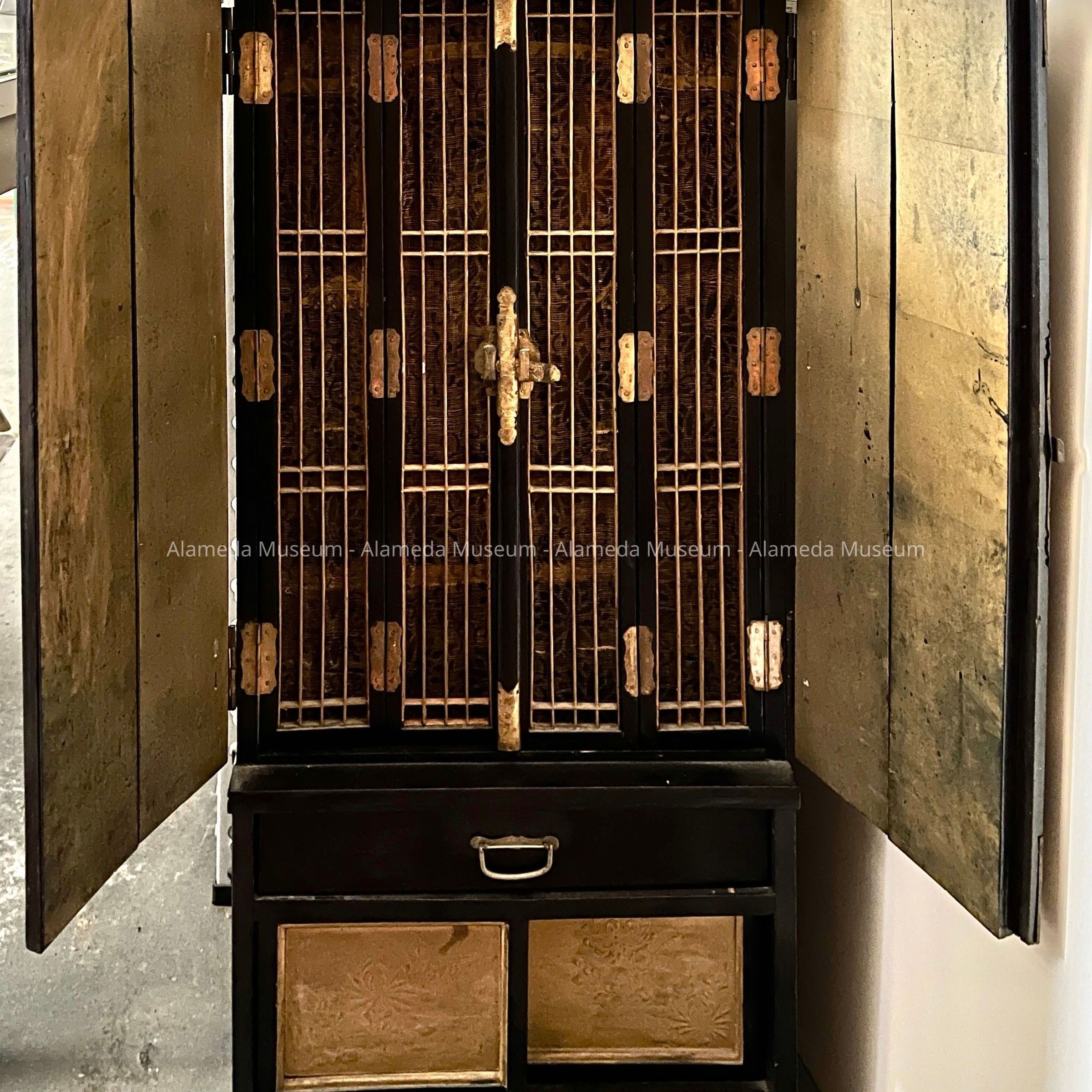 Description: a cabinet, laquered black, with two two folding doors with elaborate decorative brass hinges and locking mechanism, under which is a small drawer with brass pull, and under that a compartment closed with two sliding panels, which have embossed designs. The folding doors are painted gold on the inside.