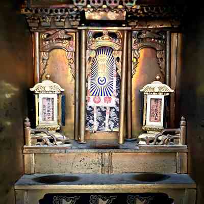 Inside the folding doors are two folding screen doors, again with decorative brass hinges and closure; inside these are two steps to a miniature wooden temple front, painted gold, with carved top, 3 sets of pillared straight arches, the ones on left and right with a carving of a bird, the center has a fabric hanging. Two small black-lacquered wood cabinets with gold-painted decorations are protected from falling down the steps with a small railing, also painted gold. When opened, these cabinets show panels with Japanese writing.