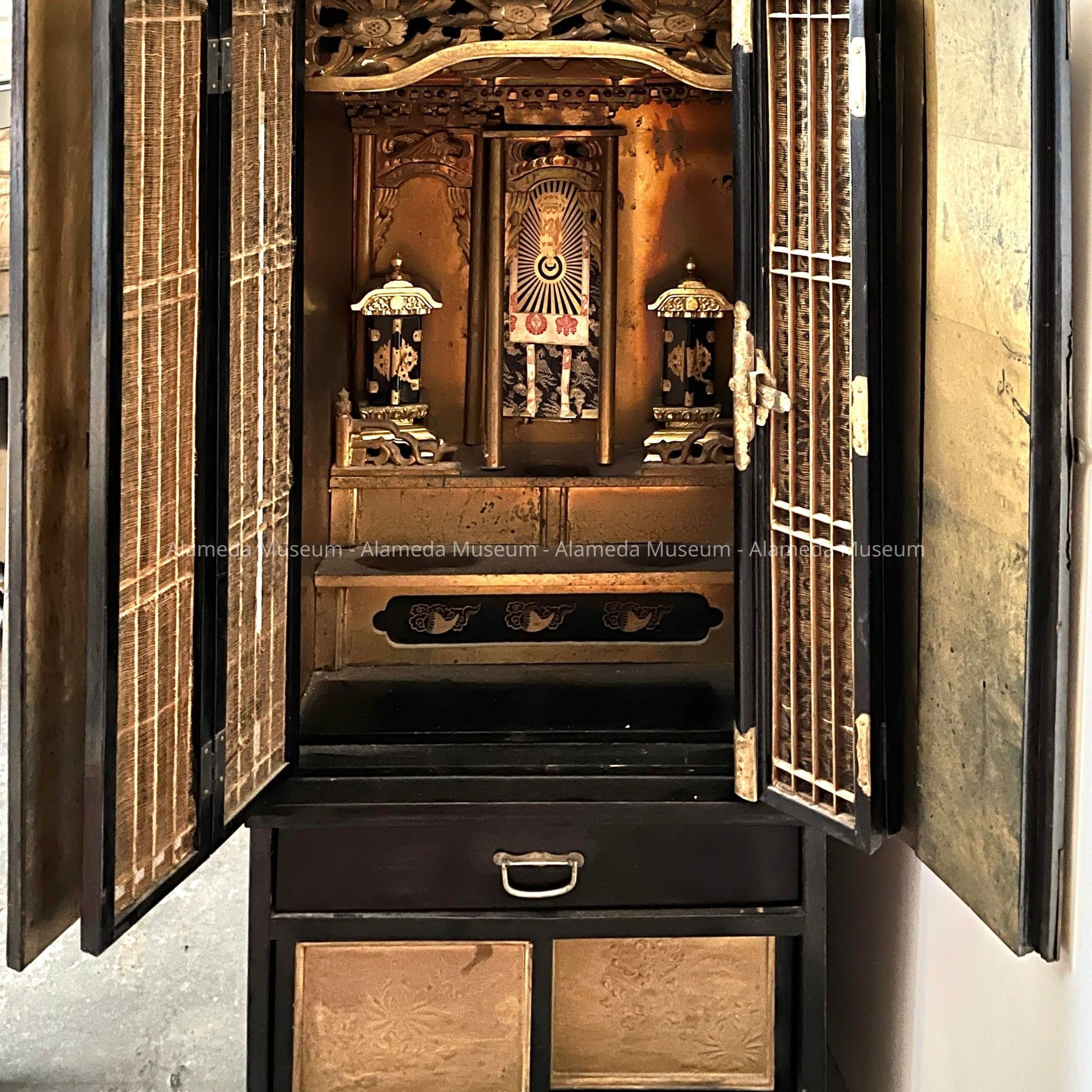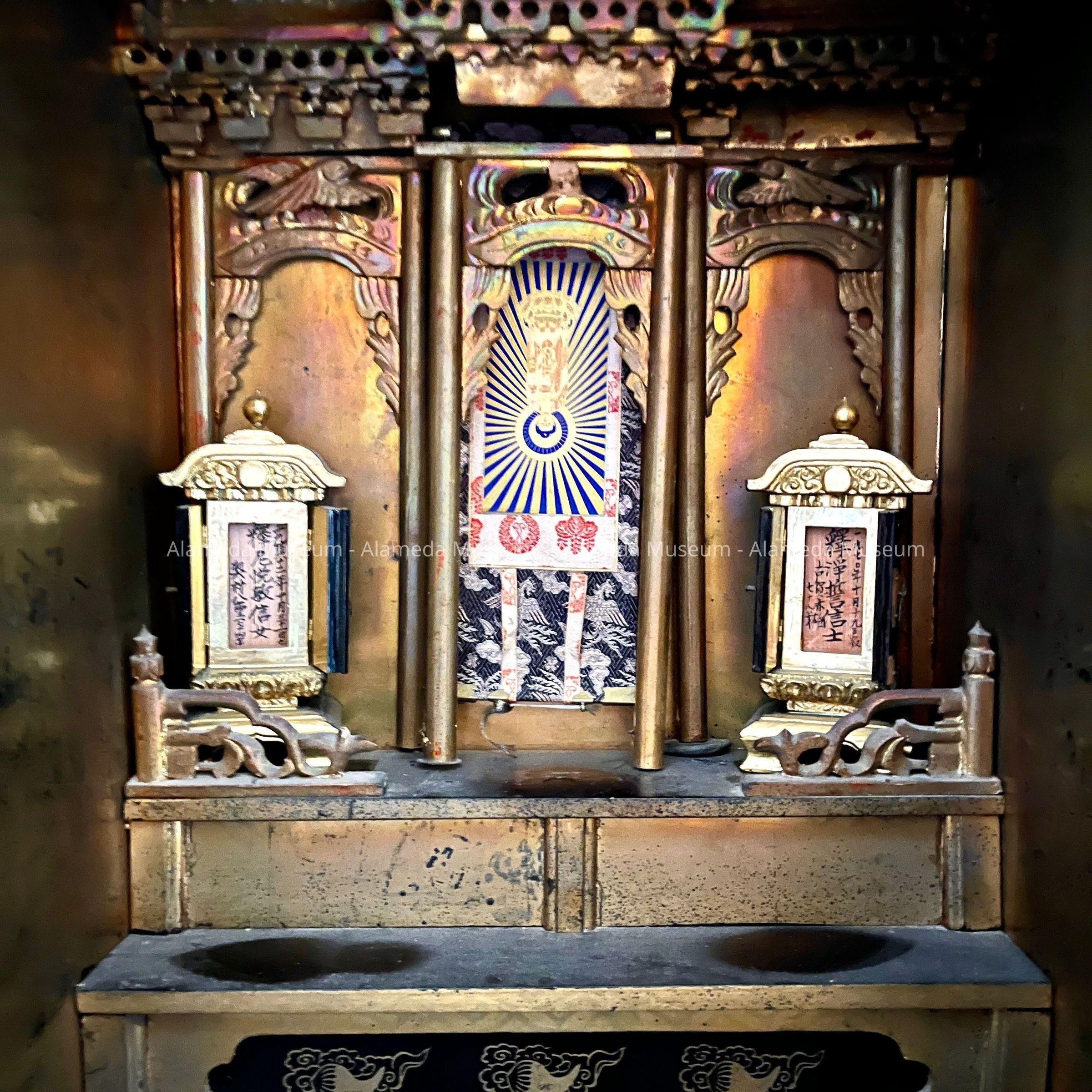 History of Object: Japanese 'Butsudan', used for Budhist devotion ceremonies within a home. The cabinet belonged to Shigeko Iwaihara (married name Kogo), a lifelong member of Alameda's Japanese community - except a few years spent in Japan as a teenager for education, and internment from 1942 to 1946. Shigeko's parents had immigrated from Japan in 1906 and 1908. Being Nissei (second generation), Shigeko was born in Alameda in 1911. She married Matao Koga In 1939 in Alameda. In 1942 she was interned in Poston, Arizona, and returned to Alameda afterwards, when Matao and Dhigeko bought and lived in a house on Pacific Avenue, until Shigeko died in 2006, aged 95.