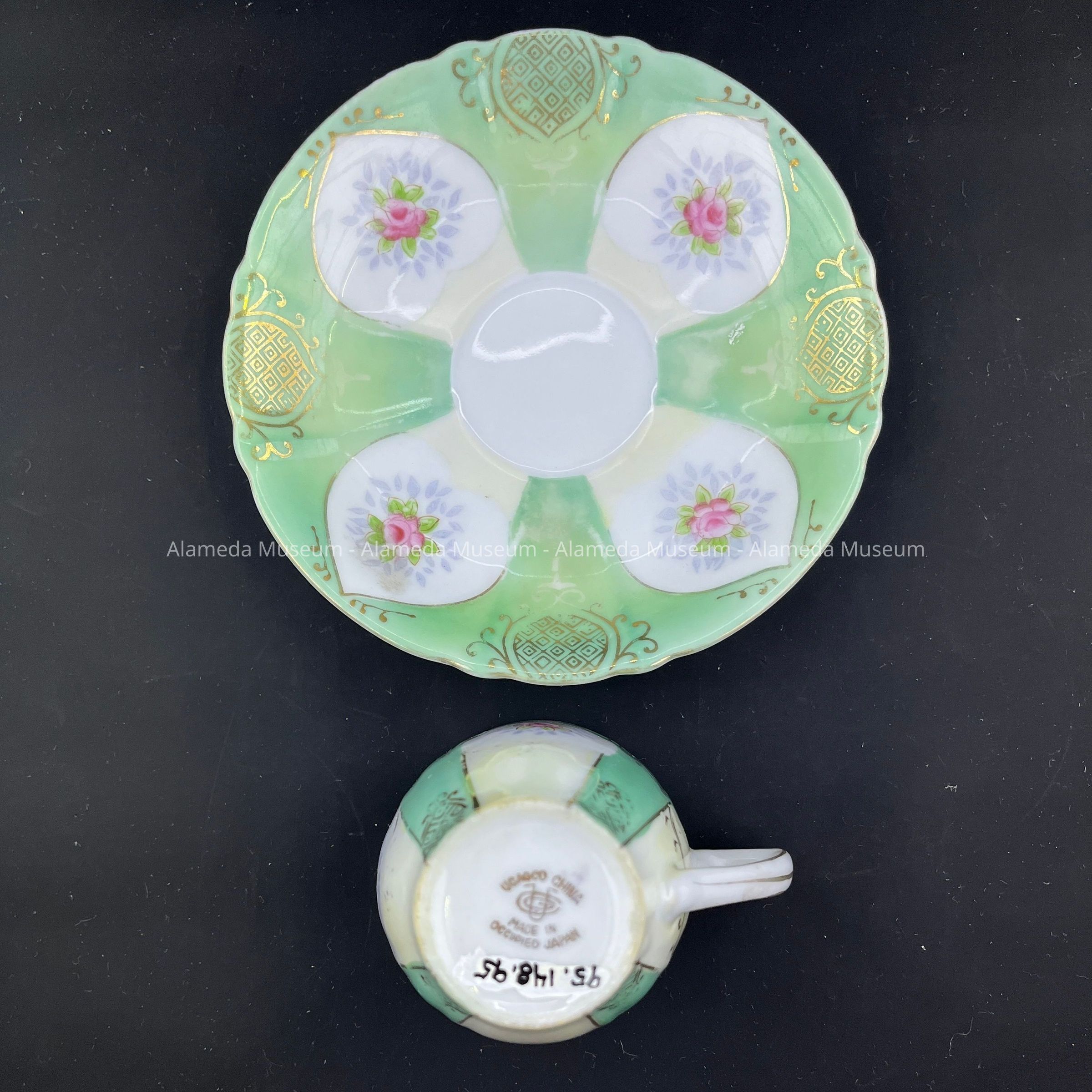 DEMITASSE-SIZE CUP AND SAUCER IN PARTIAL HAND-PAINTED AND DECAL WORK. PATTERN CONSISTS OF A SINGLE PINK ROSE ON A GREEN-COLORED BACKGROUND. SIGNED, "U. C. A. G. CO. CHINA. MADE IN OCCUPIED JAPAN."