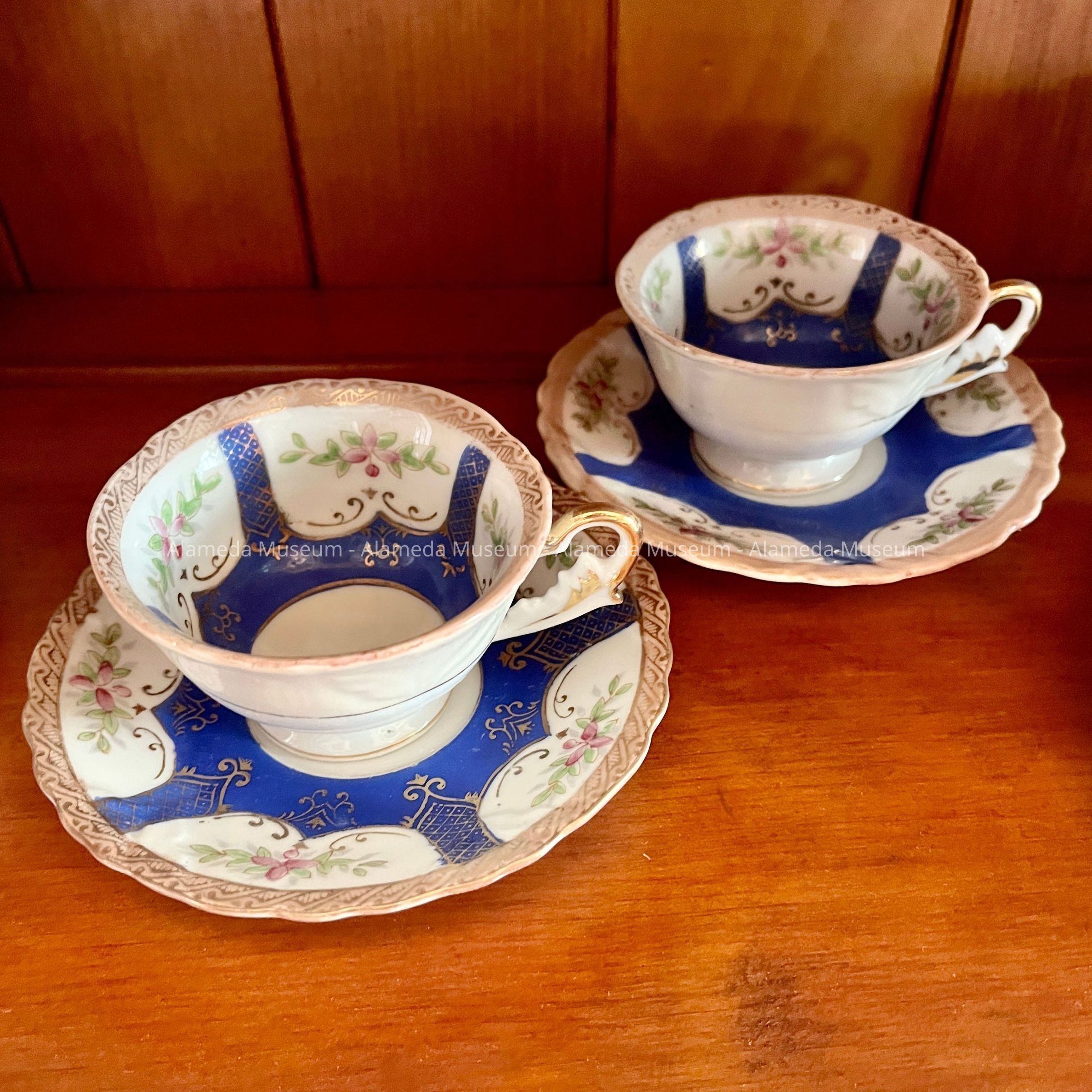 Description: DEMITASSE-SIZE MATCHING CUPS AND SAUCERS. PARTIAL TRANSFER AND HAND-PAINTED DECORATED PORCELAIN. DESIGN OF BLUE BACKGROUND WITH PINK FLOWERS TRIMMED IN GOLD. SIGNED ON BASE, "U. C. A. G. CO. CHINA. MADE IN OCCUPIED JAPAN."