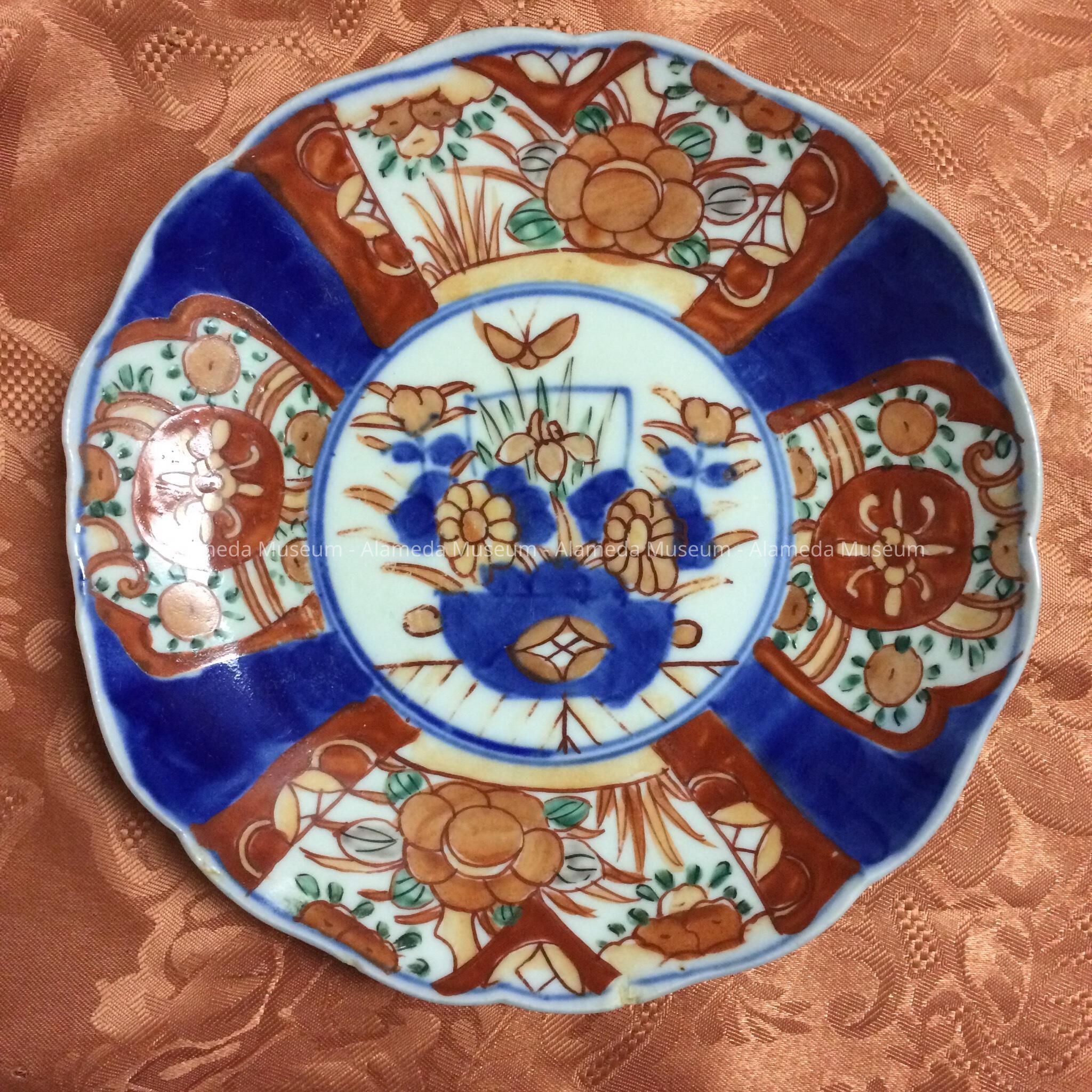 Description: Hand painted porcelain plate of Japanese origin; its design consists of flowers, medallions, etc. in a mixture of Imari red, dark blue, and green colors.
