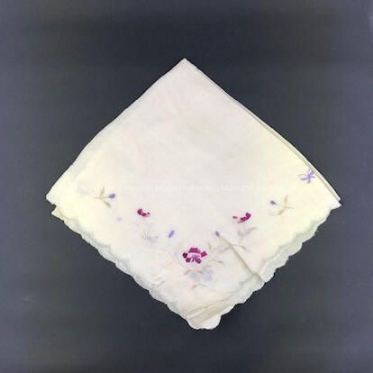 White colored raw silk handkerchief machine embroidered with burgundy and lavender flowers. Scalloped edge is also accentuated with machine embroidery of a pale blue color. Appears to be of old Japanese origin.