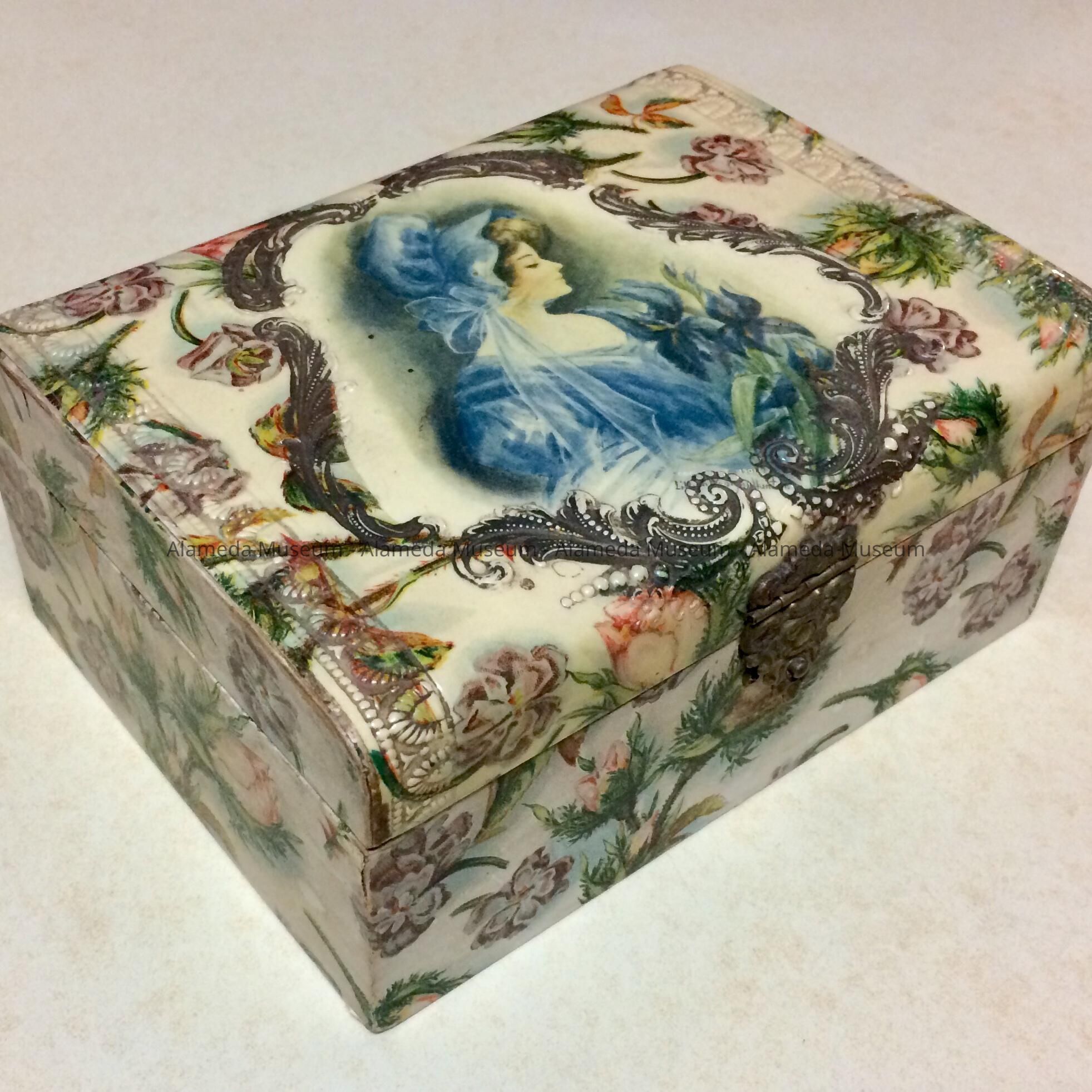 Jewel box that belonged to Mabel, wife of George Blom. Mabel, born in Texas, came to Alameda about 1920, and was a teller at the Citizen's Bank, Park Street. She was the late mother of the donor.