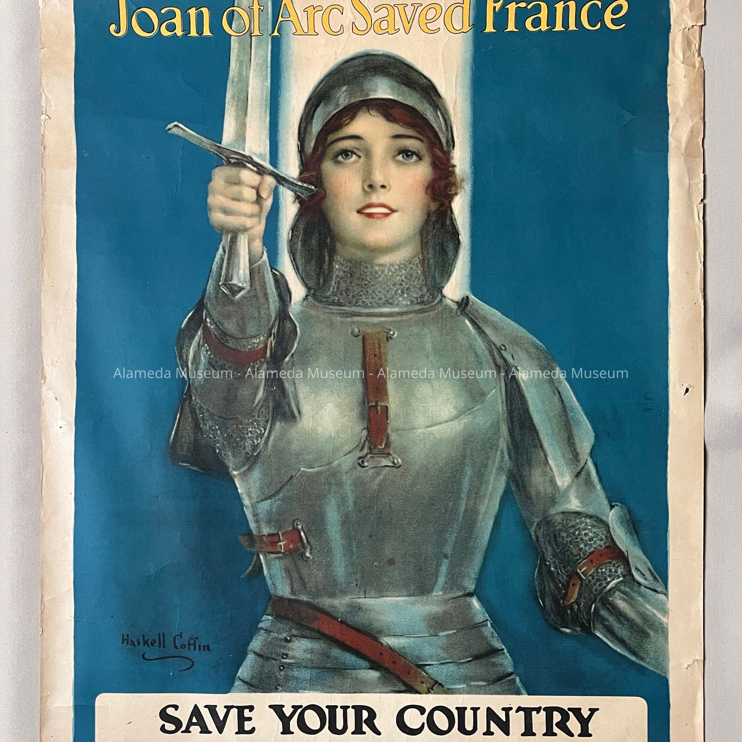 LITHOGRAPHIC POSTER FEATURING REPRESENTATION OF JOAN OF ARC, AND SIGNED BY THE ARTIST, HASKELL COFFIN. BOLD PRINTED CAPTION, "JOAN OF ARC SAVED FRANCE," IN YELLOW- AND BLACK-COLORED TYPE.