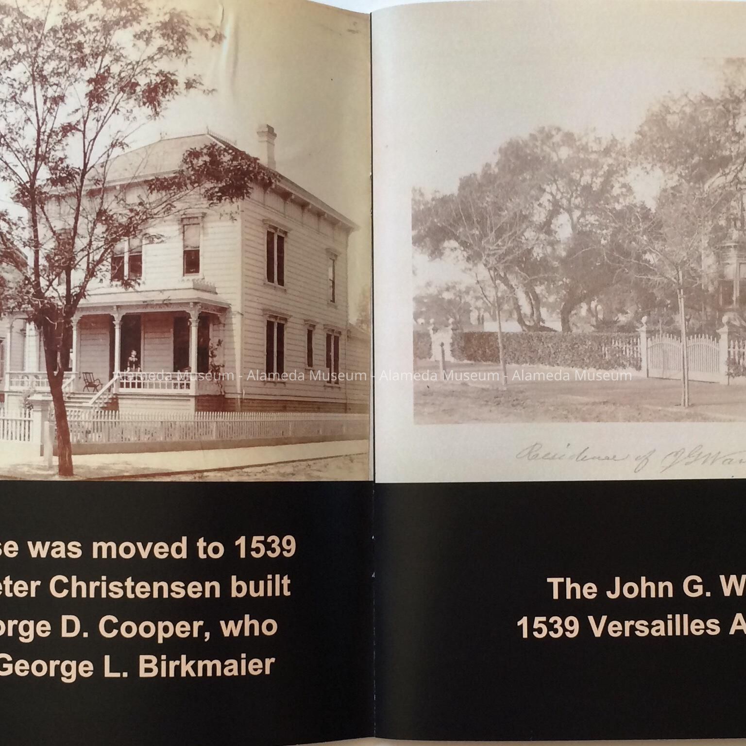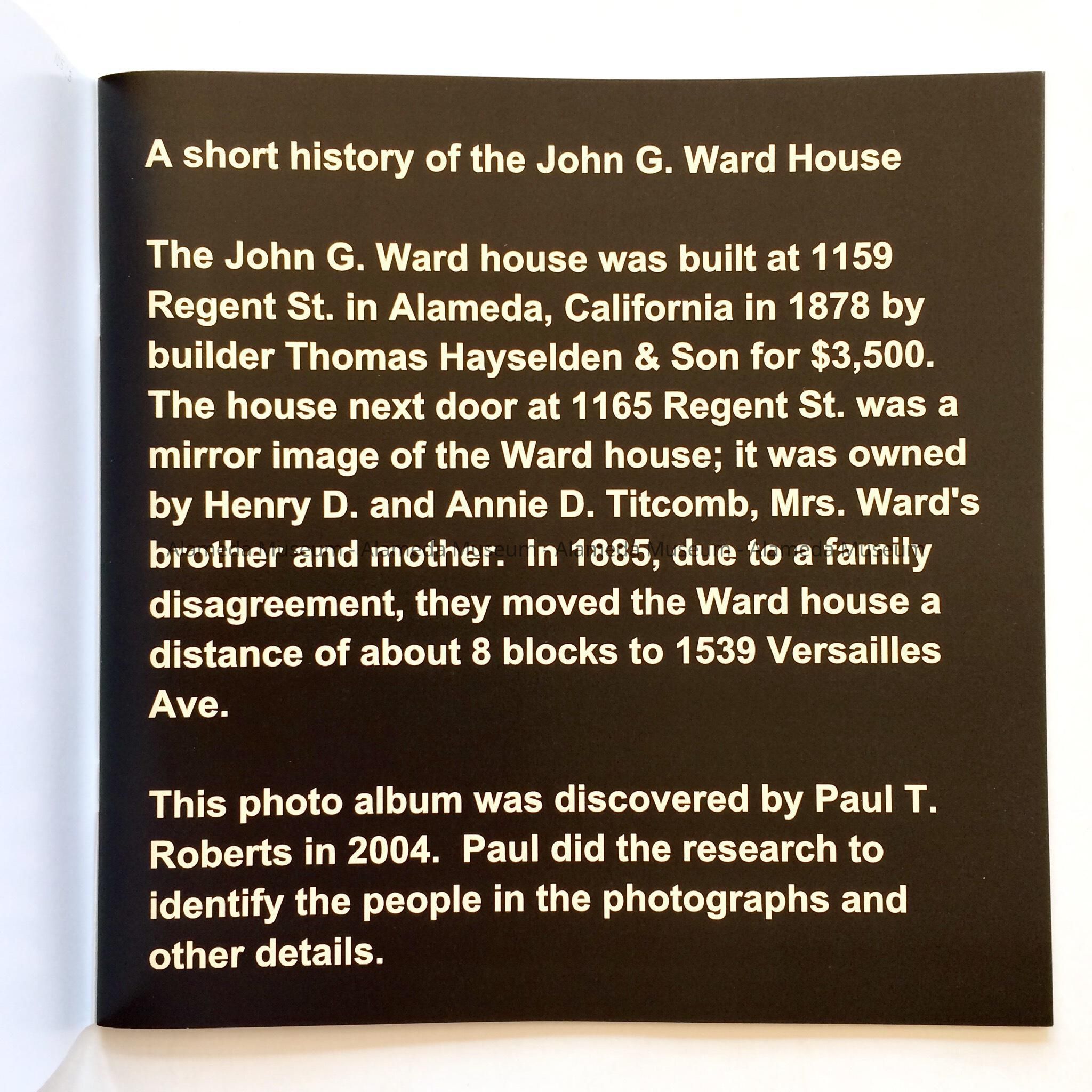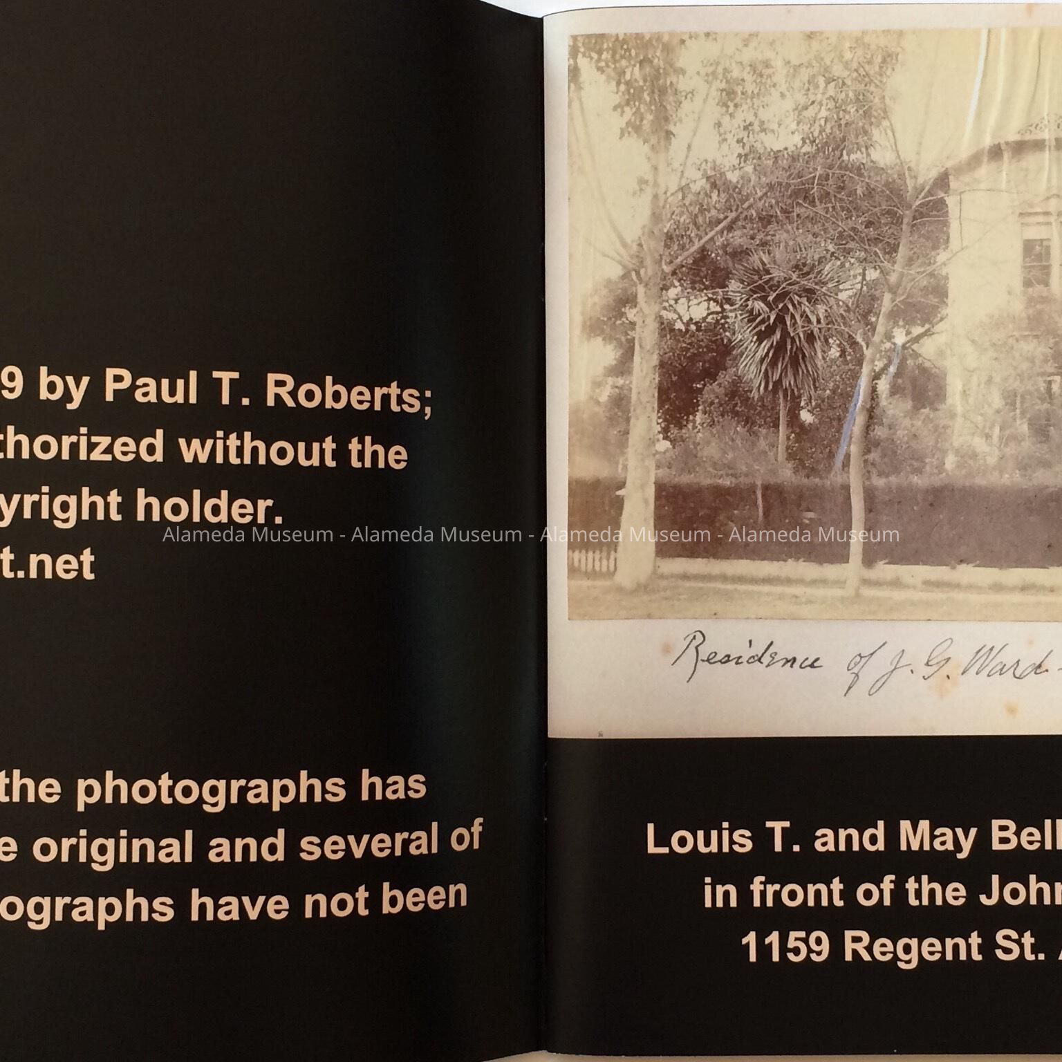 PUBLICATION ENTITLED, "JOHN G AND ANNIE T WARD ALBUM, ALAMEDA, CALIF, 1884-1890." RESEARCHED BY PAUL T ROBERTS. A BOOKLET ILLUSTRATED WITH PHOTOGRAPHS TAKEN BY THE WARD FAMILY, WHOSE HOME WAS ORIGINALLY LOCATED AT 1159 REGENT STREET. THE HOME WAS LATER MOVED TO 1539 VERSAILLES ST. THE HISTORICAL PHOTOS INCLUDED THE EXTERIOR AND INTERIOR OF THE HOME, AS WELL AS THOSE OF THE FAMILY.