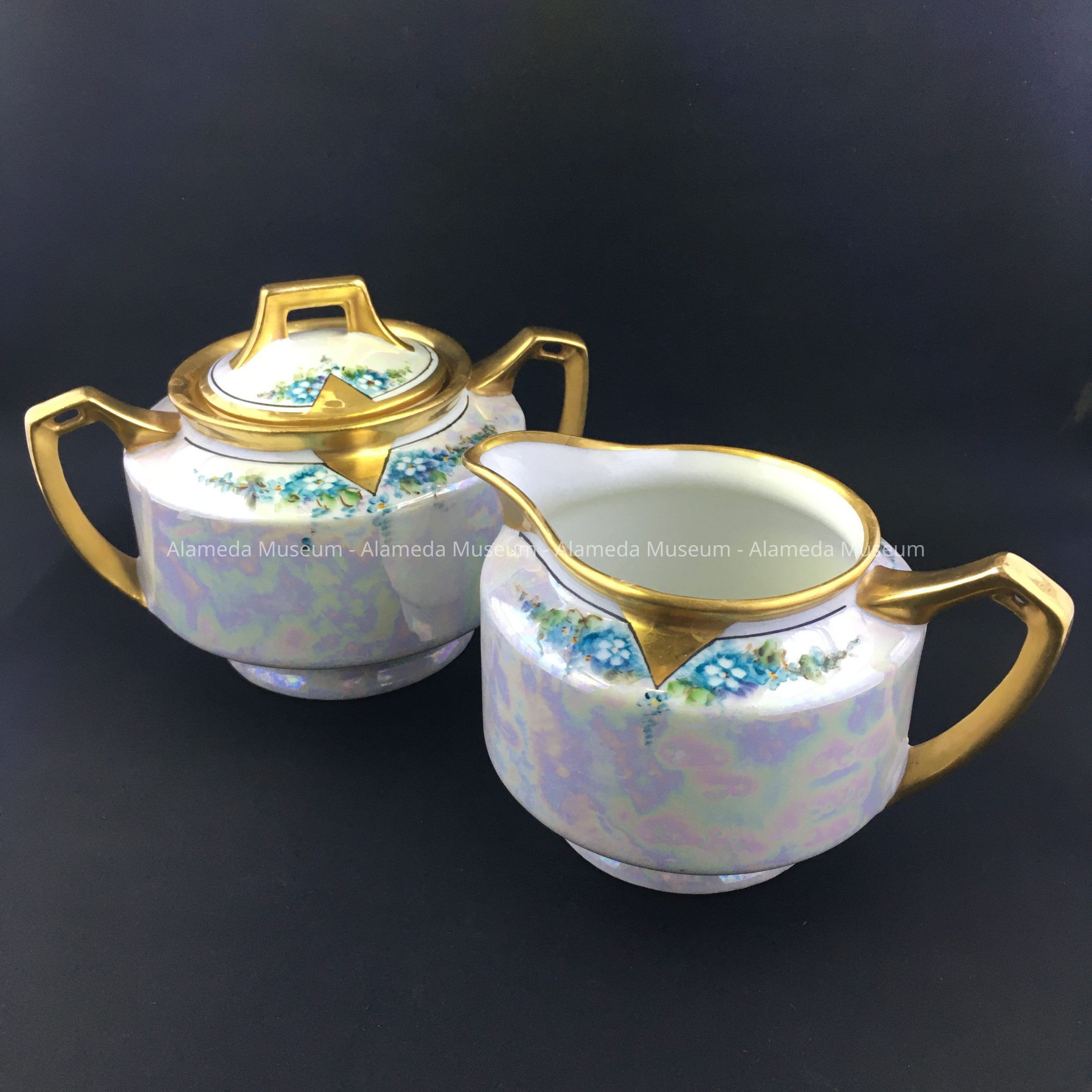 Description: A cream and sugar set with hand painted blue colored flowers on a luster background. The handles and rim are in gold. Handles have a decorative rectangular hole at the top.