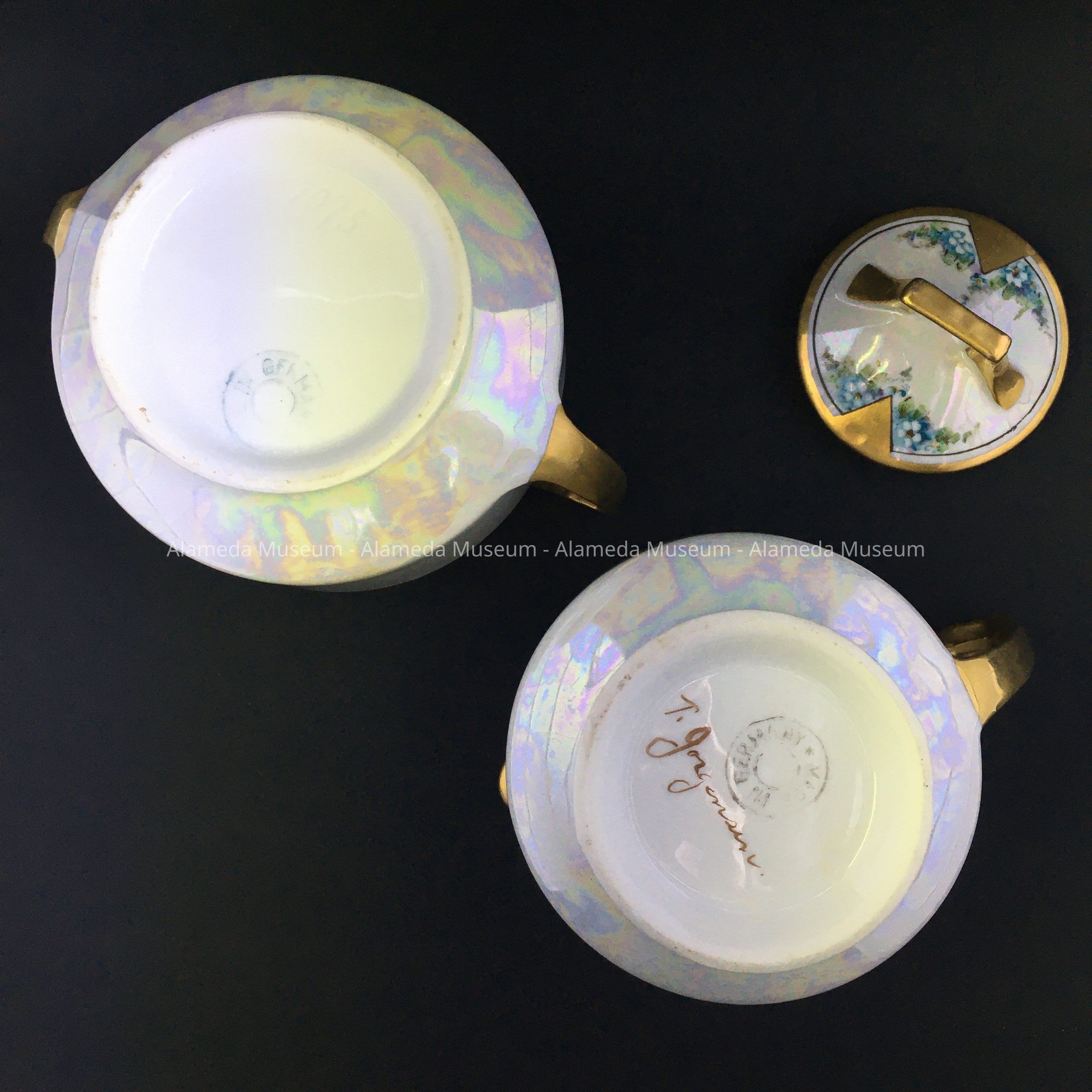 History of Object: A hand painted porcelain set by Thomas Jorgensen of Alameda. He would import blanks from Europe, and hand paint them and glaze the pieces.