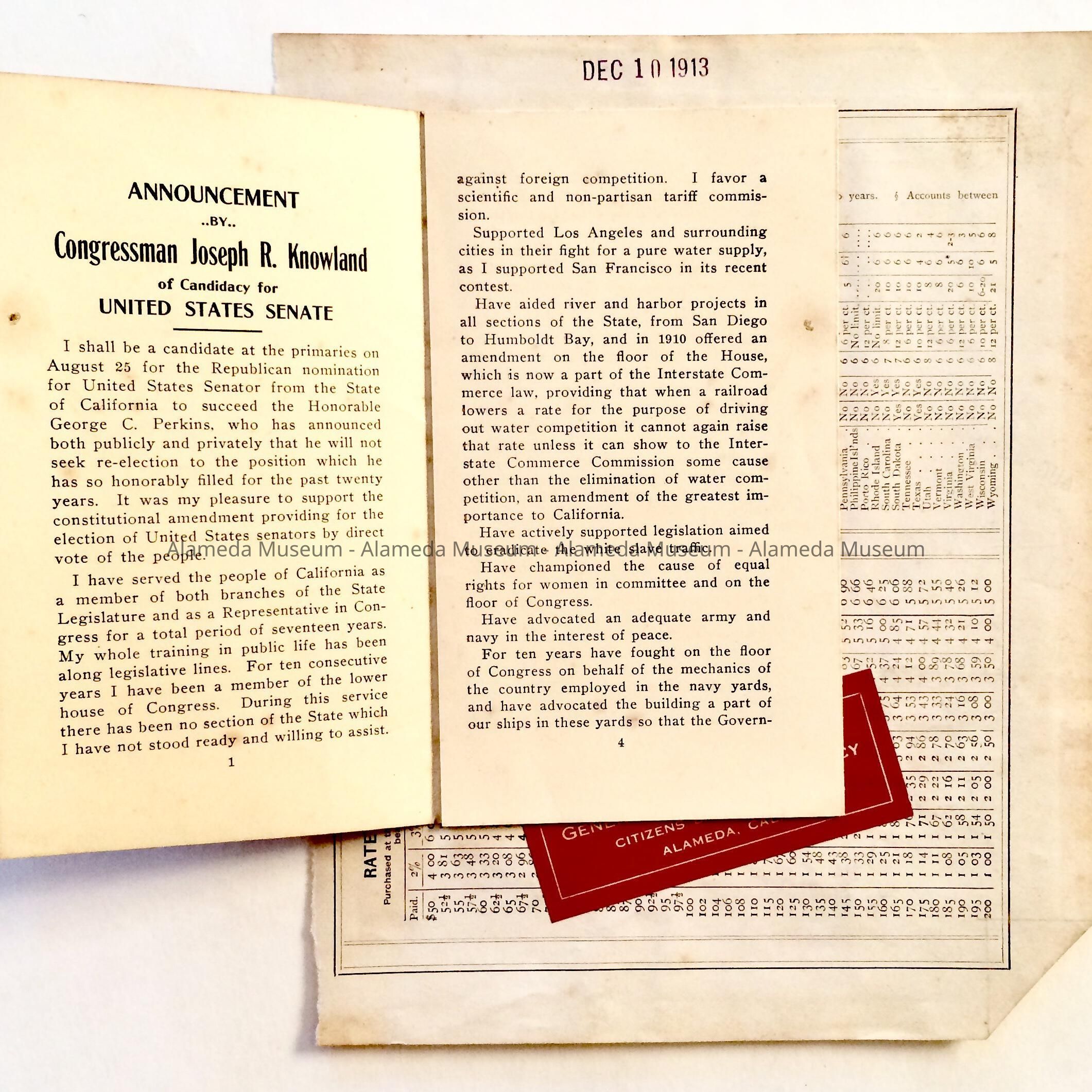 Journal page + Joseph Knowland campaign booklet and Herbert D. Clark business label, 1913Entry/Object ID