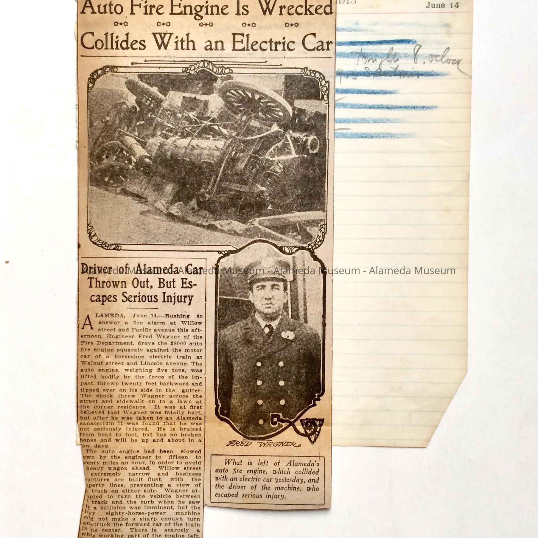 History of Object: Newspaper clipping concerning the wreck of the first Alameda Fire Department motorized vehicle with an electric train at Walnut street and Lincoln avenue, June 14, 1913. The fire truck was driven by Fred Wagner.