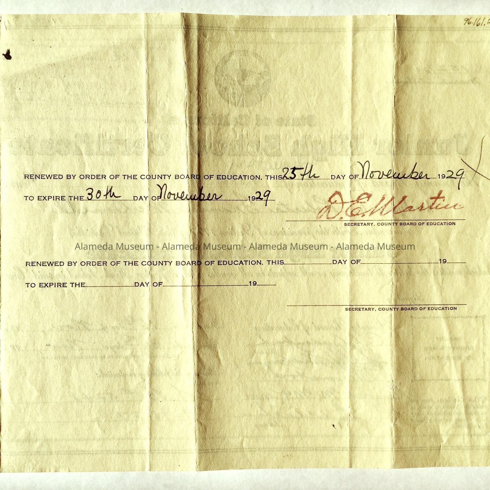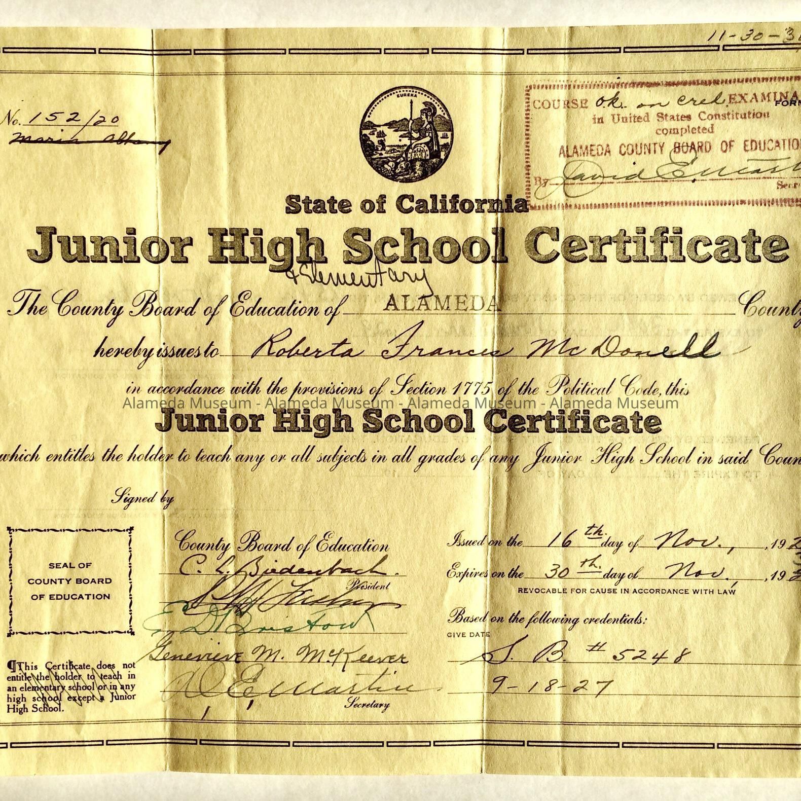 CERTIFICATE ENTITLING ROBERTA FRANCES MCDONELL TO TEACH JUNIOR HIGH SCHOOL IN THE STATE OF CALIFORNIA. ISSUED ON NOVEMBER 16, 1927.