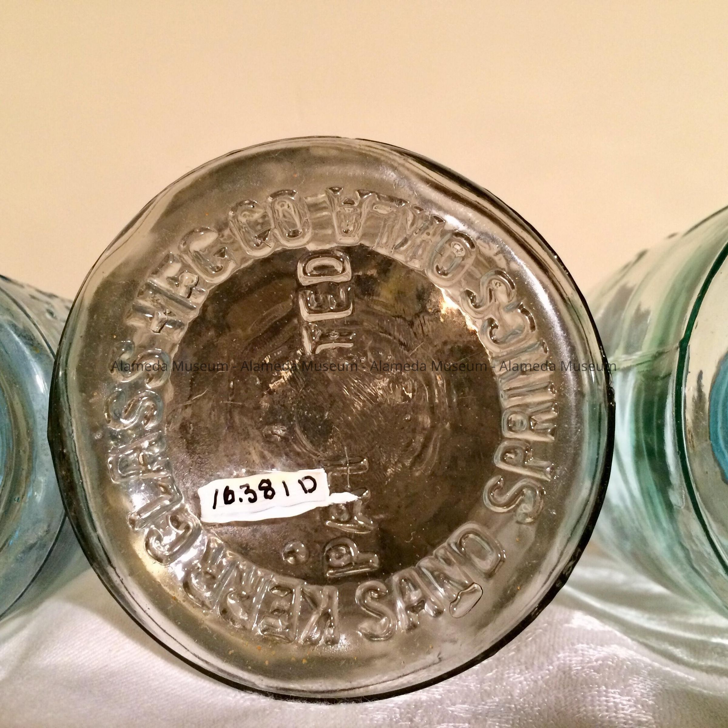 D. CLEAR GLASS JAR WITH METAL TOP AND IRON CLAMP, EMBOSSED LETTERING, "KERR ECONOMY" TRADEMARK.