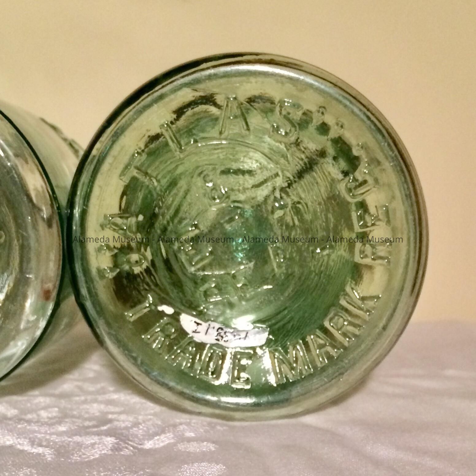 I. PALE GREEN JAR WITH GLASS TOP AND IRON BALE SEALER WITH EMBOSSED LETTERING, "ATLAS E-Z SEAL."