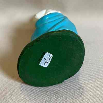 Description: Statuette of gypsum of a woman, kneeling on the right knee, with hands folded, head tilted left. The figure is hand-painted and glazed, with dark brown hair, wearing a white under-robe with head-scarf, a sky-blue cloak or shawl, and orange shoes. A line of gold-paint decorates the hem and sleeves. The base is painted grass-green. Underside is stamped: 'Germany' in black.