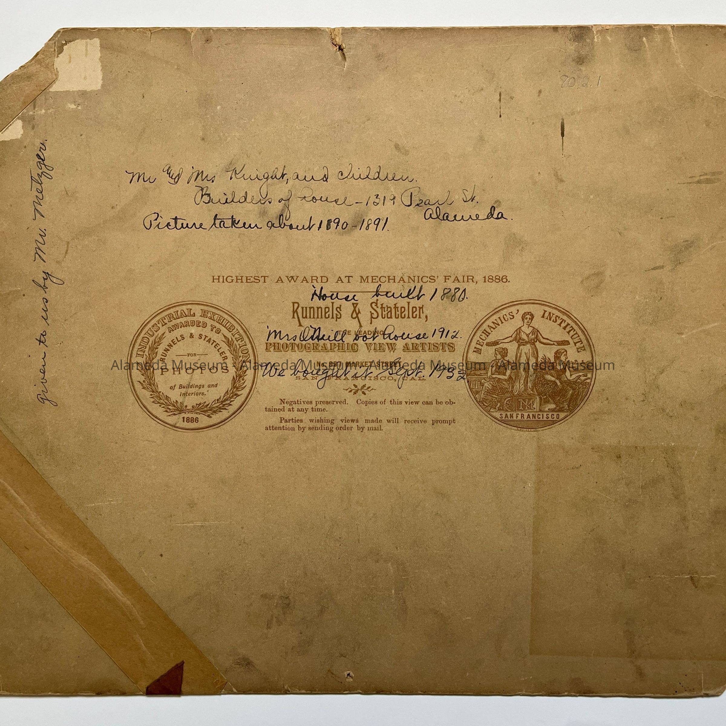 Mr. and Mrs. Knight and children, builders of house, 1319 Pearl St., Alameda, Picture taken about 1890-91. House built 1880. Mrs. O'Neill bought house 1912. We bought it Sept, 1932 (Metzger).