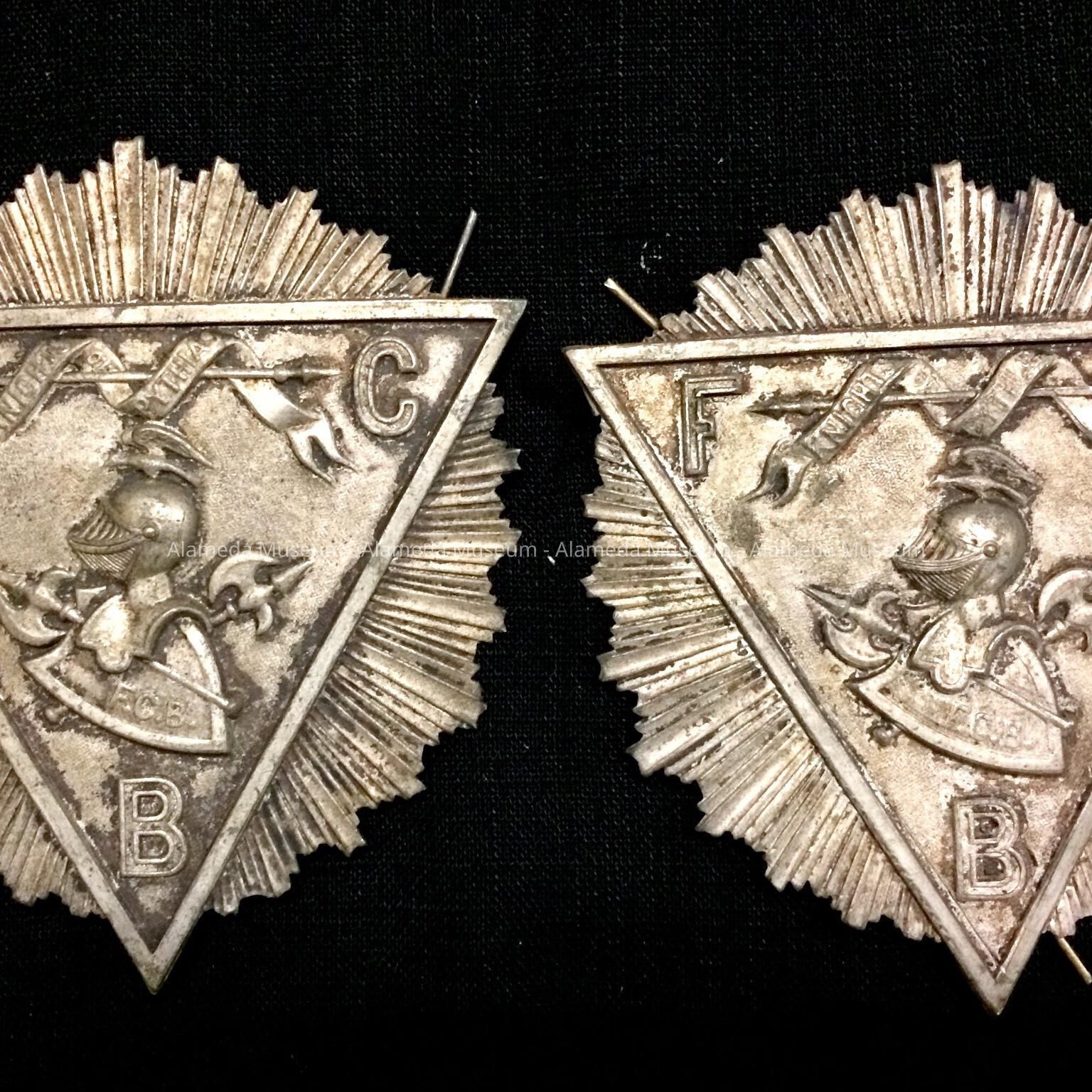 SILVER-PLATED EMBOSSED EMBLEM, WITH LOGO OF ARMOR HELMET AND INITIALS, "FCB."