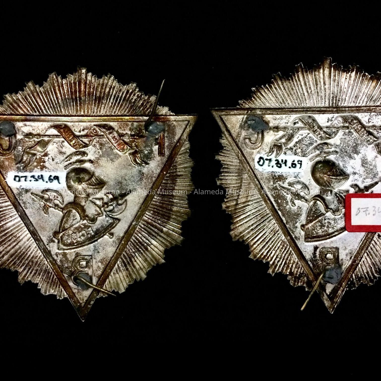 AN EMBLEM IN THE SHAPE OF A TRIANGLE SURROUNDED BY SUN RAYS. IT IS EITHER A HAT EMBLEM FROM THE KNIGHTS OF PYTHIAS LODGE (A PHILANTHROPIC FRATERNAL ORGANIZATION) OR ?