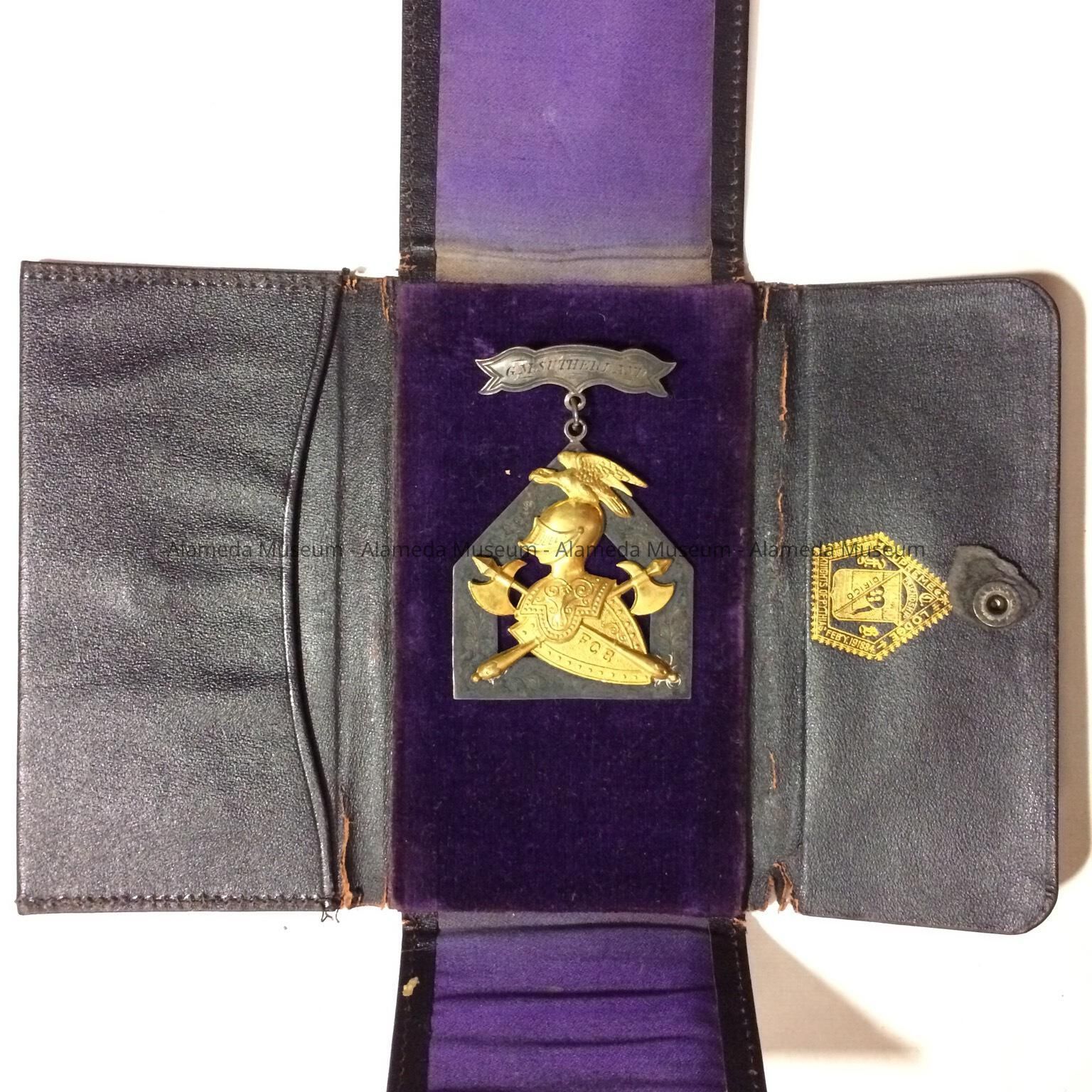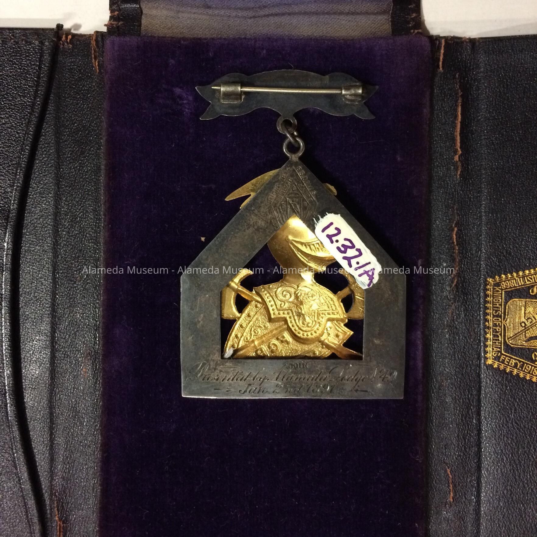 History of Object: Knights of Pythias medal, engraved, presented by Alameda Lodge No. 49, January 2, 1891. It was presented to George M. Sutherland, a local druggist.