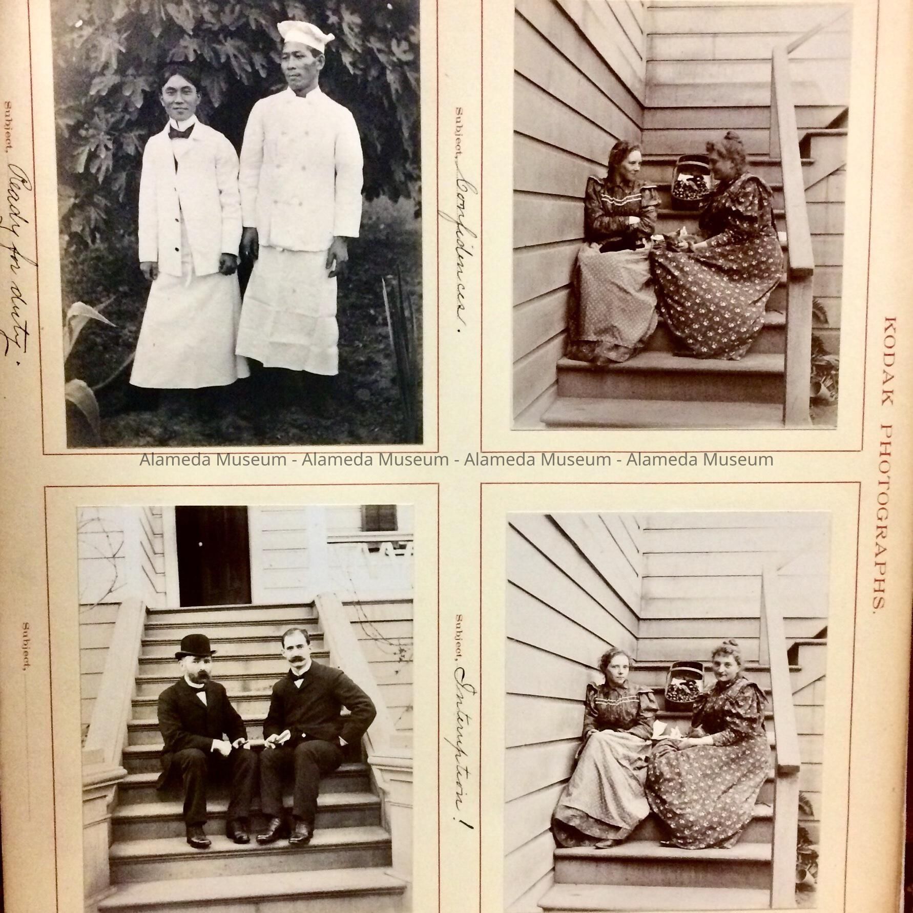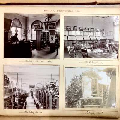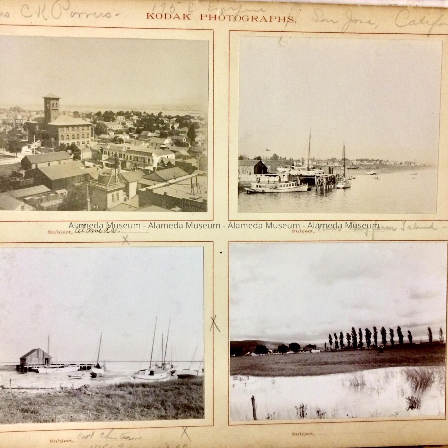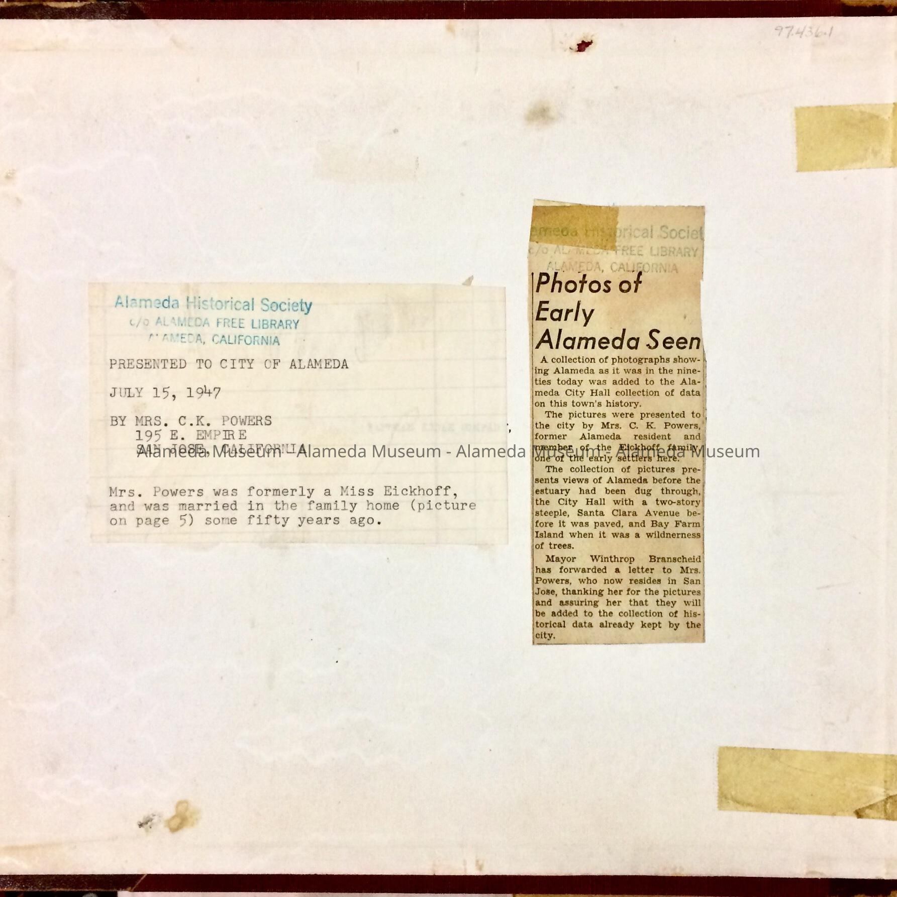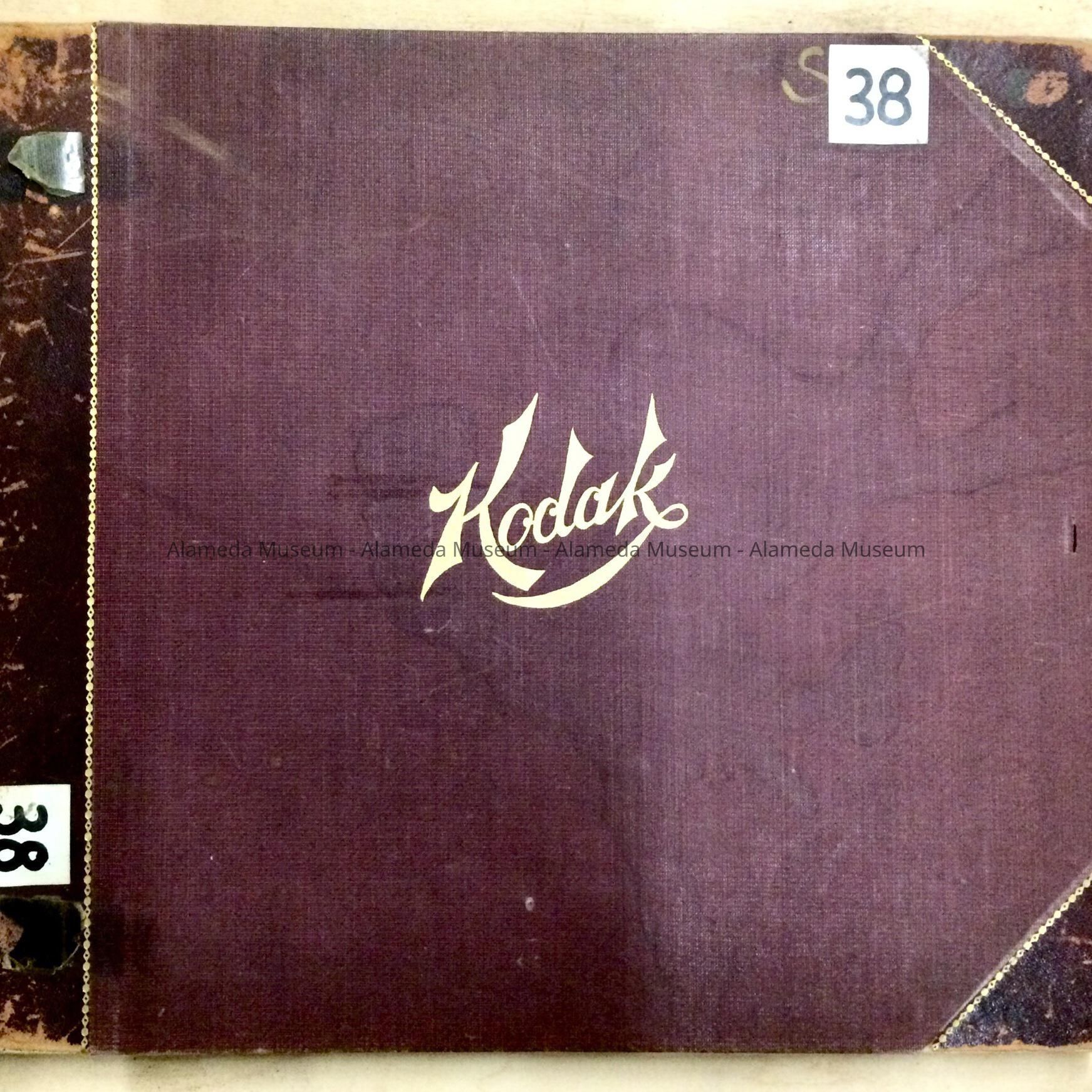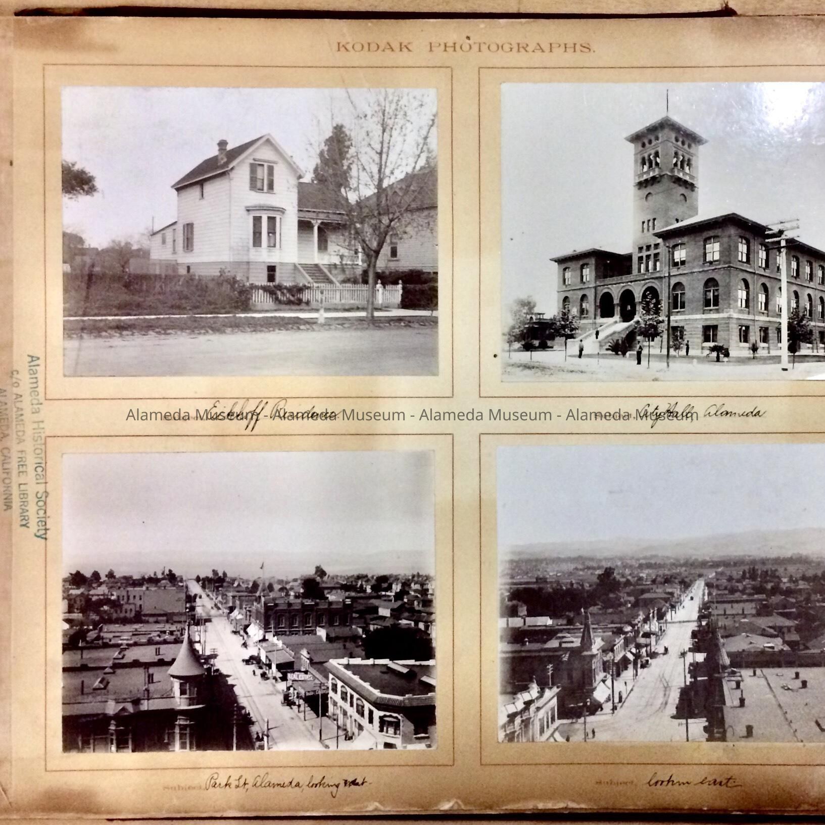 INTERESTING KODAK PHOTO ALBUM, WITH EARLY VIEWS OF THE CITY OF ALAMEDA, INCLUDING A VIEW OF PARK STREET LOOKING BOTH SOUTH AND NORTH, CITY HALL (WITH TOWER) BEFORE 1906, SHORELINE NEAR BAY FARM ISLAND, ANDERSON'S WHARF, AND INTERIOR SHOTS OF THE ALAMEDA FREE LIBRARY (DATED 1899, WHEN IT WAS LOCATED IN THE WEST WING OF CITY HALL). ALBUM WAS COMPILED BY THE EICKHOFF FAMILY. DONOR WAS A MEMBER OF THAT FAMILY. ALBUM WAS PRESENTED TO THE CITY OF ALAMEDA ON JULY 15, 1947; SUBSEQUENTLY PRESENTED TO THE ALAMEDA HISTORICAL SOCIETY; NUMBERED "S-38," BUT NEVER OFFICIALLY CATALOGED.