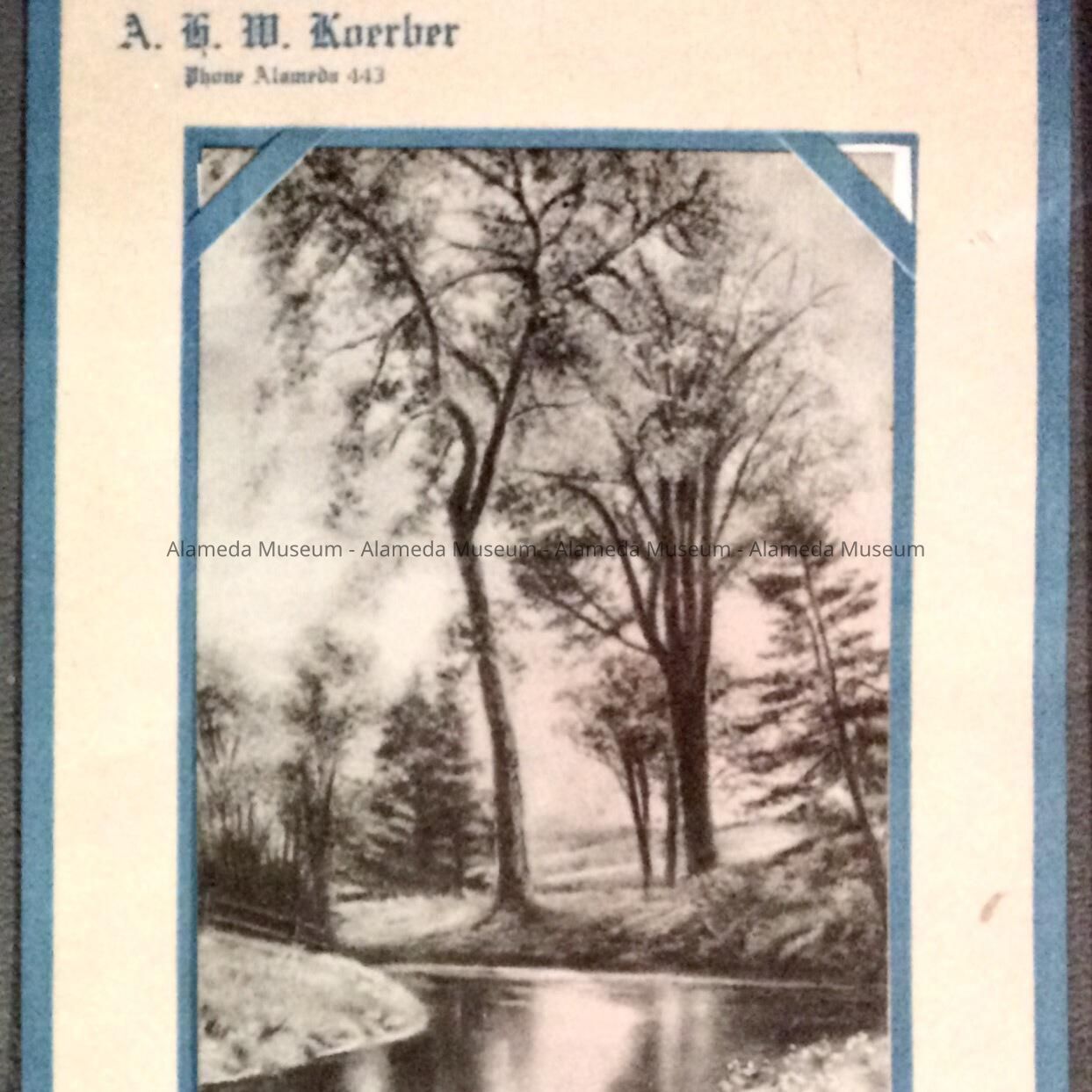 Description: Printed calendar, subject scene of river with trees in background. Print in pale colors which appears as if it is an original water color. This is mounted in paper fasteners to an off-white background sheet which contains a calendar booklet, dated 1916 (fastened to the bottom of the calendar) and the inscription in blue type in upper left hand corner "Greetings of the Season from A. H. W. Koerber, Phone Alameda 442". The same blue color is repeated as trim around the printed scene and edge of calendar. The top of the panel is pierced and a blue ribbon is tied through the holes for hanging.