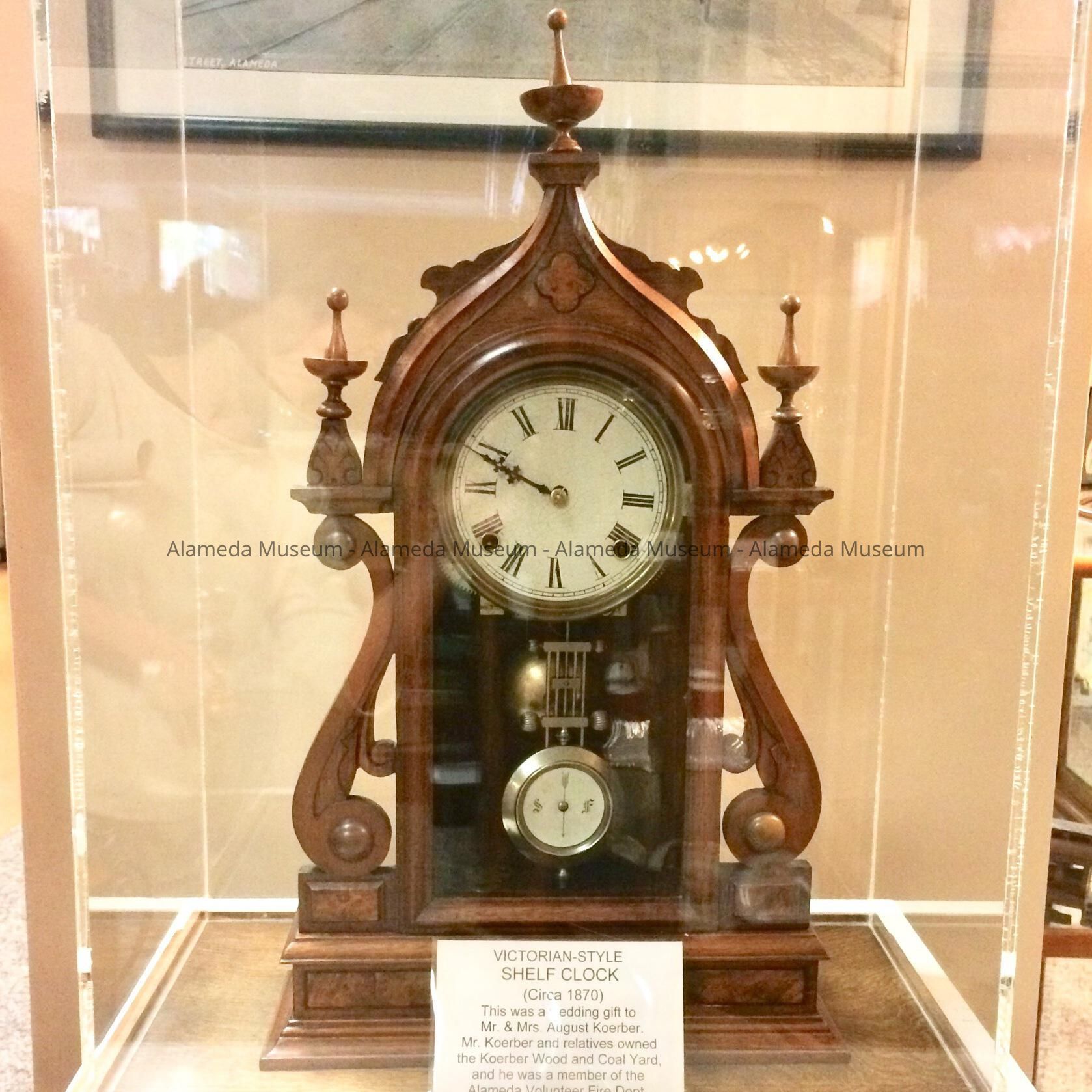 History of Object: Victorian shelf clock, circa 1870, a wedding present to Mr. & Mrs. August Koerber. Mr. Koerber and relatives own the Koerber Wood and Coal Yards. He was also appointed a member of the Alameda Volunteer Fire Department.