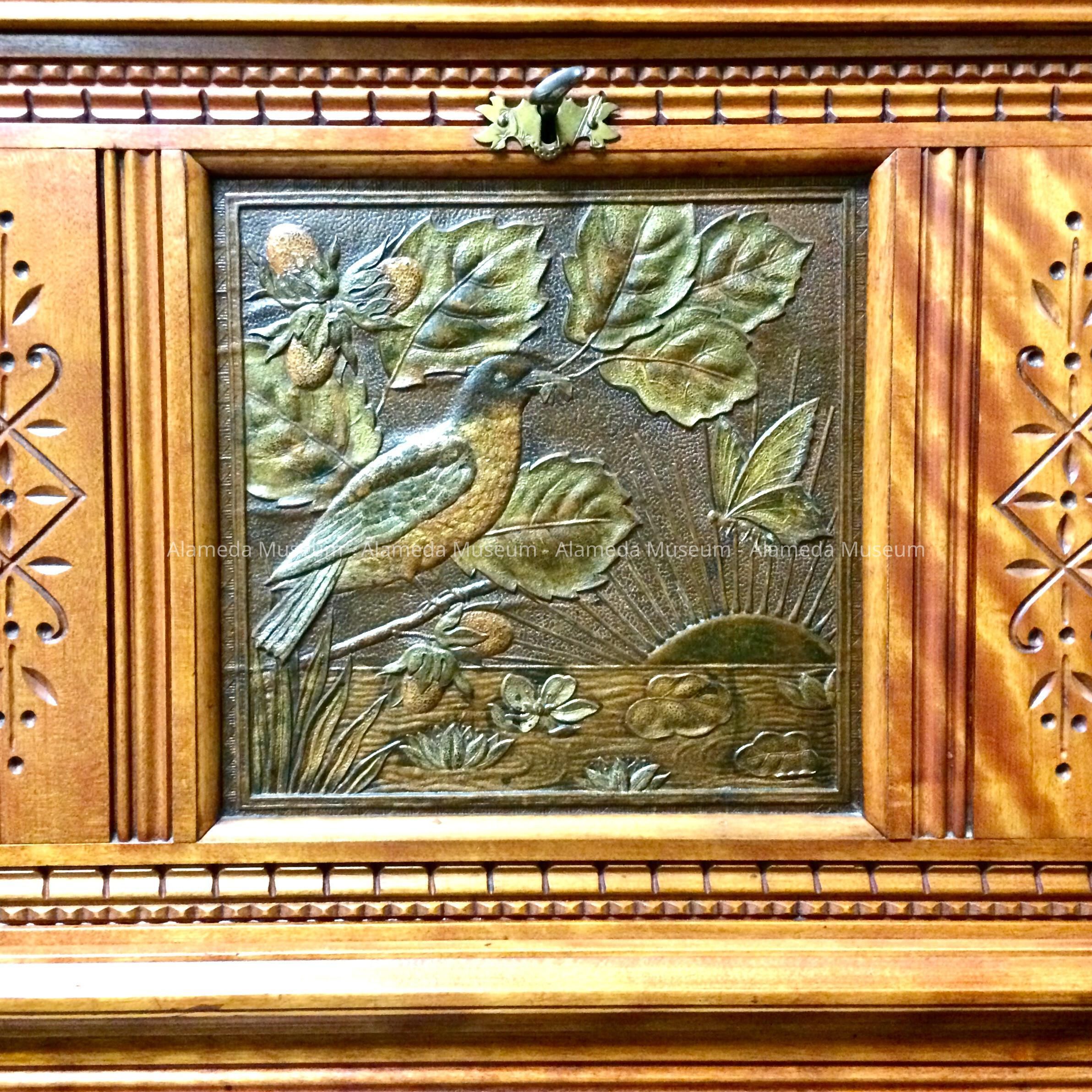 Description: A drop-front lady's desk in the American Eastlake style; the wood appears to be cherry. The desk includes side shelves and an upper top with two platforms for books or bric-a-brac. The desk also includes two shallow drawers with patinated brass bale handles. The exterior panel that serves as the desk top has an inset panel of embossed cardboard depicting a bird perched on a branch having leaves and berries and includes a butterfly in flight. The decorations throughout this piece have incised carvings.
