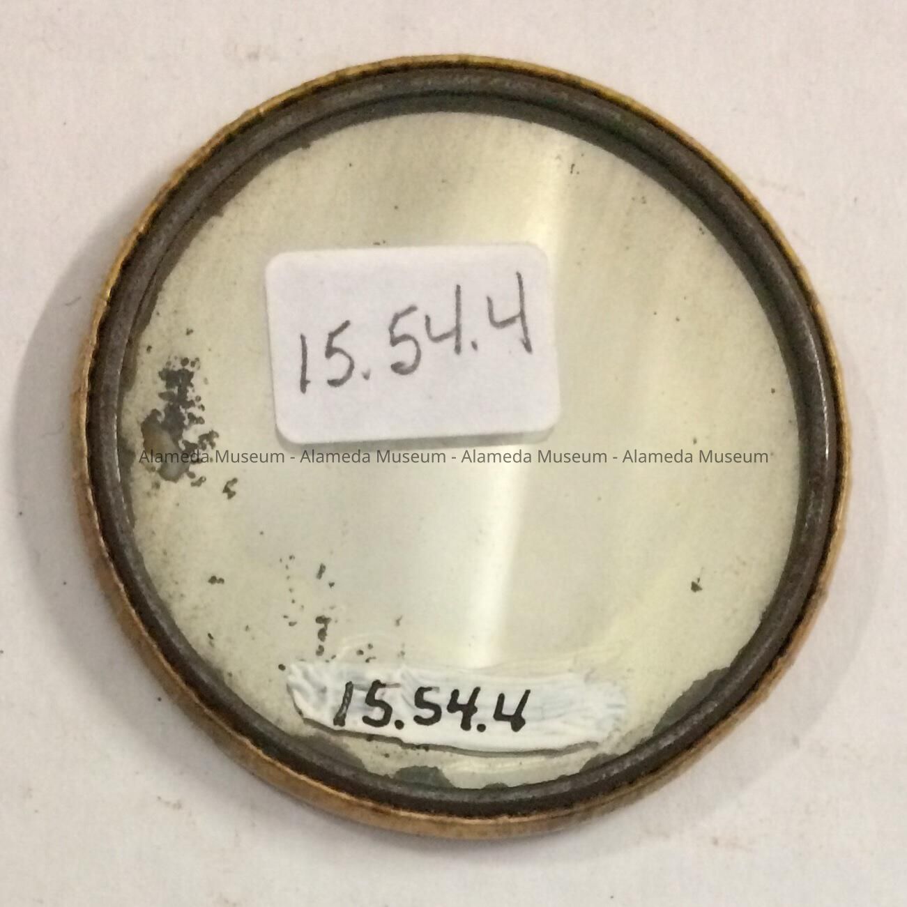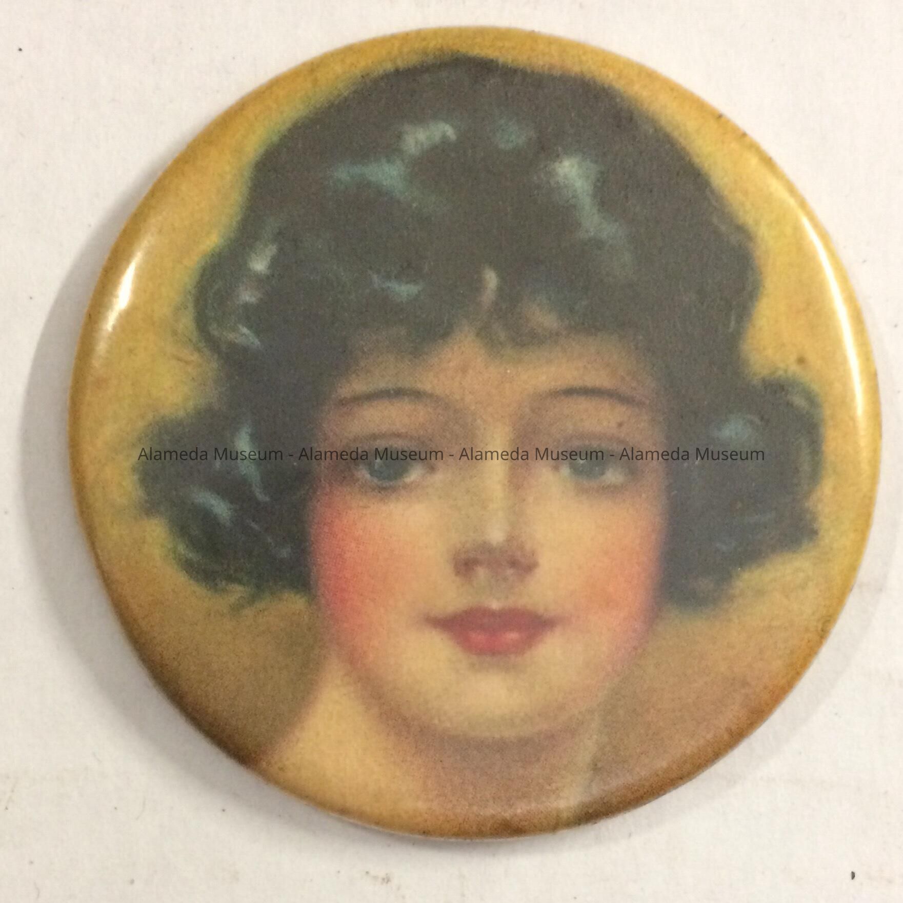 DESCRIPTION: A CIRCULAR SHAPED POCKET OR PURSE MIRROR, PROTECTED BY A COVER OF CELLULOID, WITH A PORTRAIT OF A WOMAN WITH BLACK HAIR.