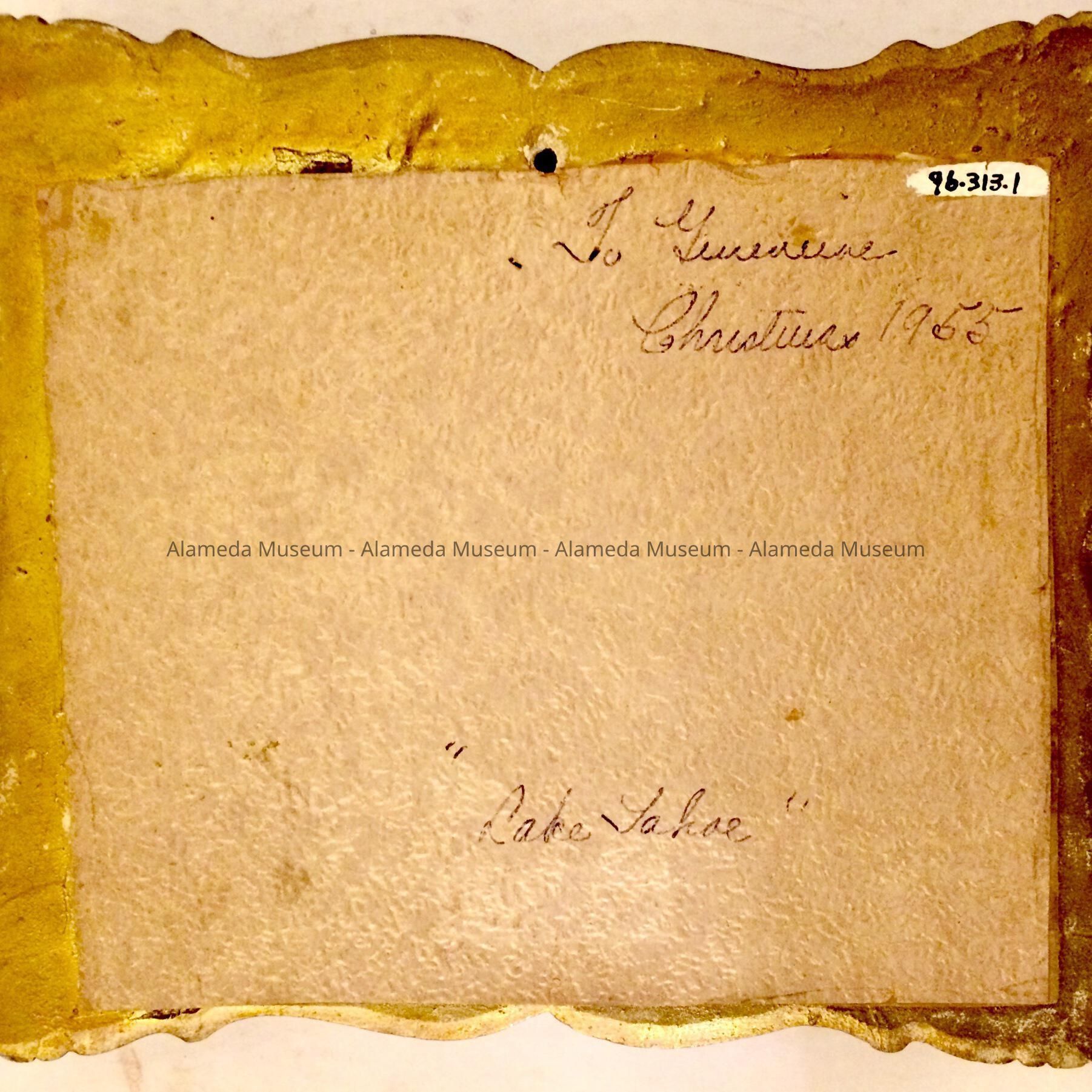 HISTORY OF OBJECT: THIS PAINTING WAS IDENTIFIED BY BETTE DE TREVILLE, DOCENT AT THE ALAMEDA HISTORICAL MUSEUM, AS BEING PAINTED BY RICHARD De TREVILLE, HER FATHER. BETTE MARRIED DON MCKEAN. BETTE AND OTHER FAMILY MEMBERS WERE ARTISTS; THEY CAME TO ALAMEDA IN THE EARLY 1920's. GENEVIEVE WAS WES PEASE'S MOTHER. PAT DE TREVILLE WAS WIDOW OF BETTE'S BROTHER.