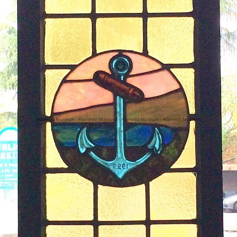 DESCRIPTION: Lancet window with Gothic tracery. Predominant colors are amber, blue and white. Has ruby glass center medallion of an anchor with the date "1929". Green paint on exterior side; interior side is natural wood varnished.
