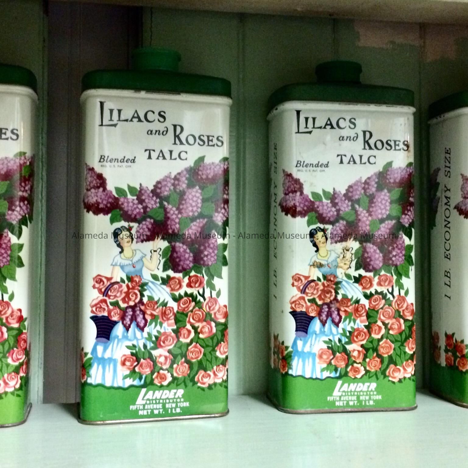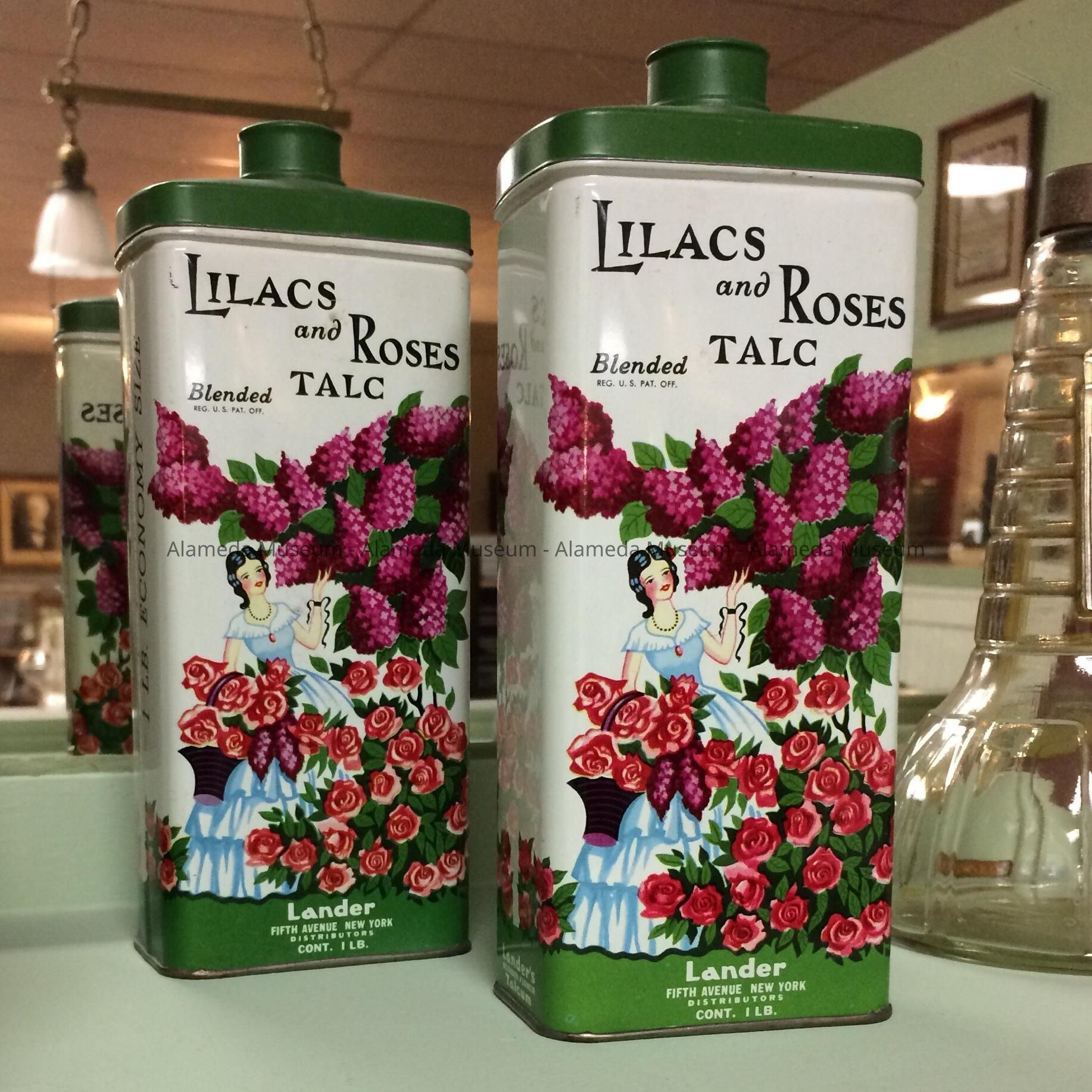 Oblong Metal (tin) can, off-white background with green top and lid, on front and back depicting lilacs, roses, and a girl in sleeveless pale blue dress with hoops and flounces, holding clippers and a basket of each. Label: "Lilacs and Roses Talc", "Blended", "REG. U.S. PAT. OFF.", "LANDER distributor", "Fifth Avenue New York", "Net Wt. 1 LB.".